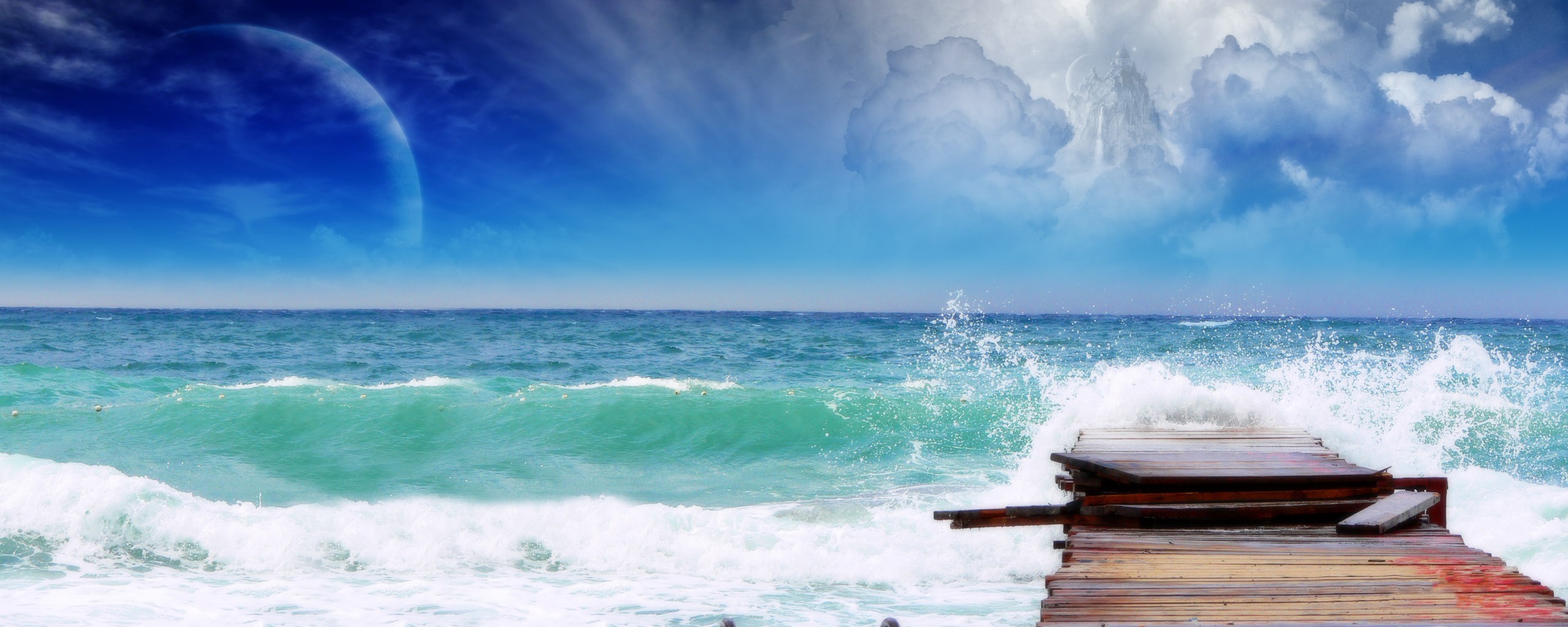 Le onde verdi del mare si infrangono su un molo sotto un cielo blu, in cui è visibile un castello d'aria dalle nuvole