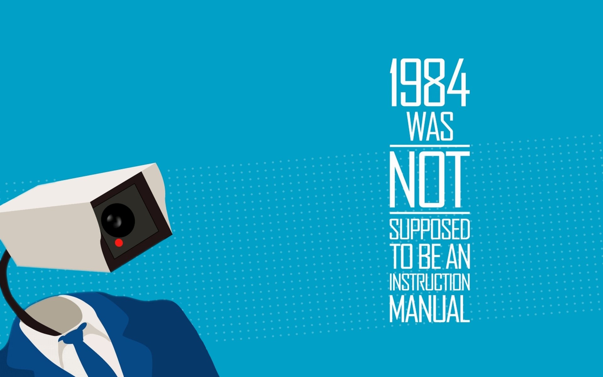 Fotocamera con filo che sporge da un abito da uomo d'affari e iscrizione su sfondo blu