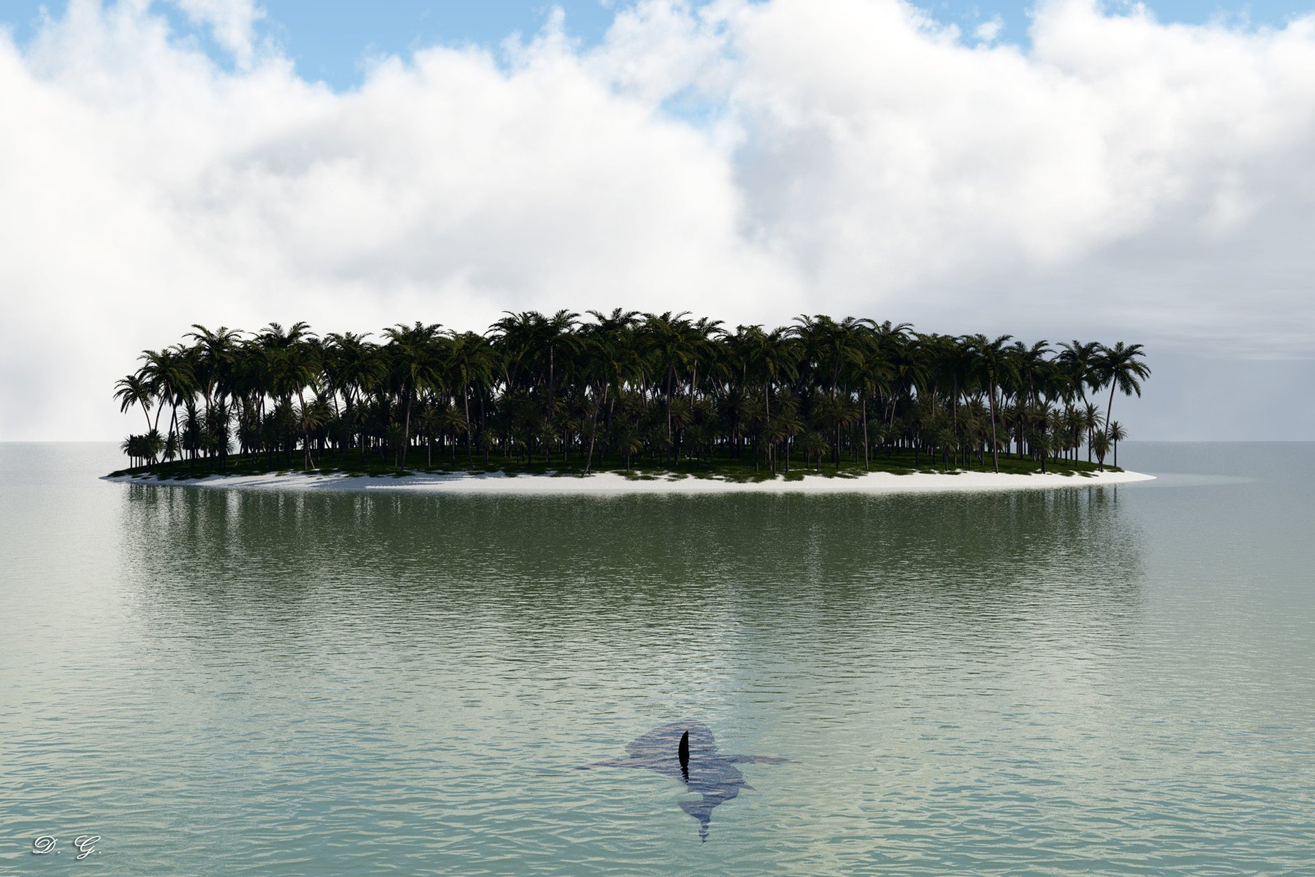 Isola rocciosa con alberi di Natale in mezzo al lago