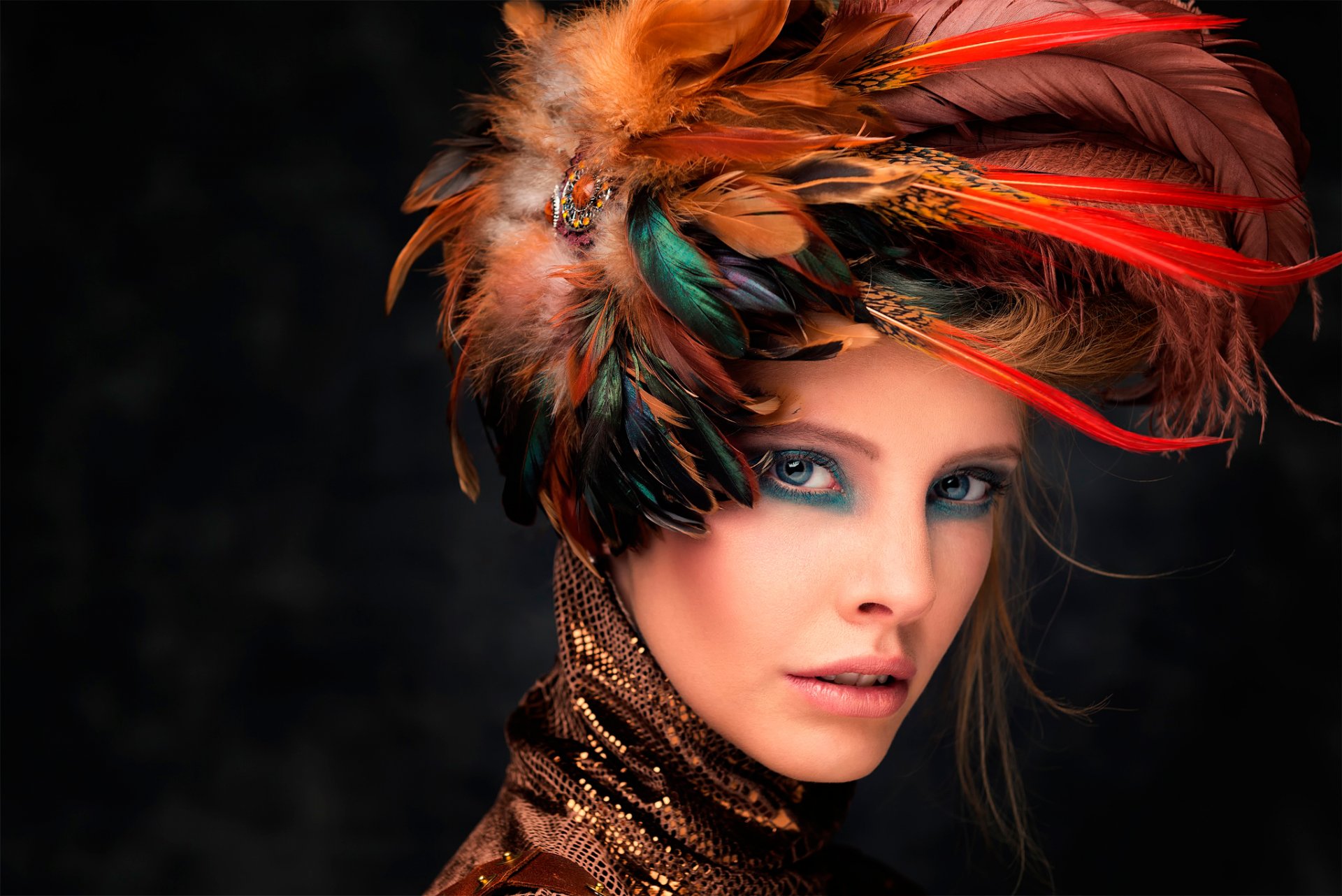 Ragazza con il trucco con il copricapo con le piume