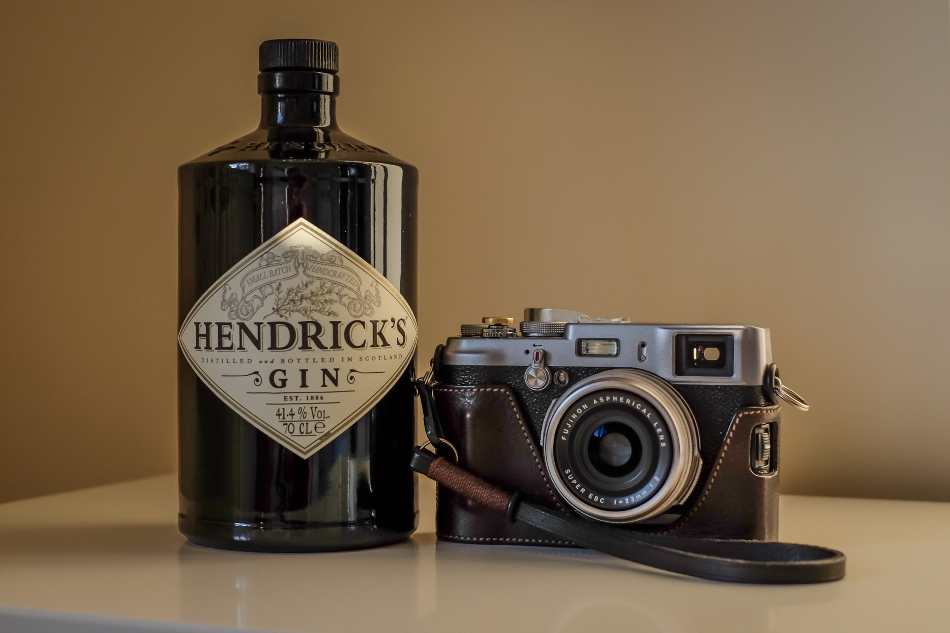 Fotocamera in una custodia sullo sfondo di una bottiglia di gin