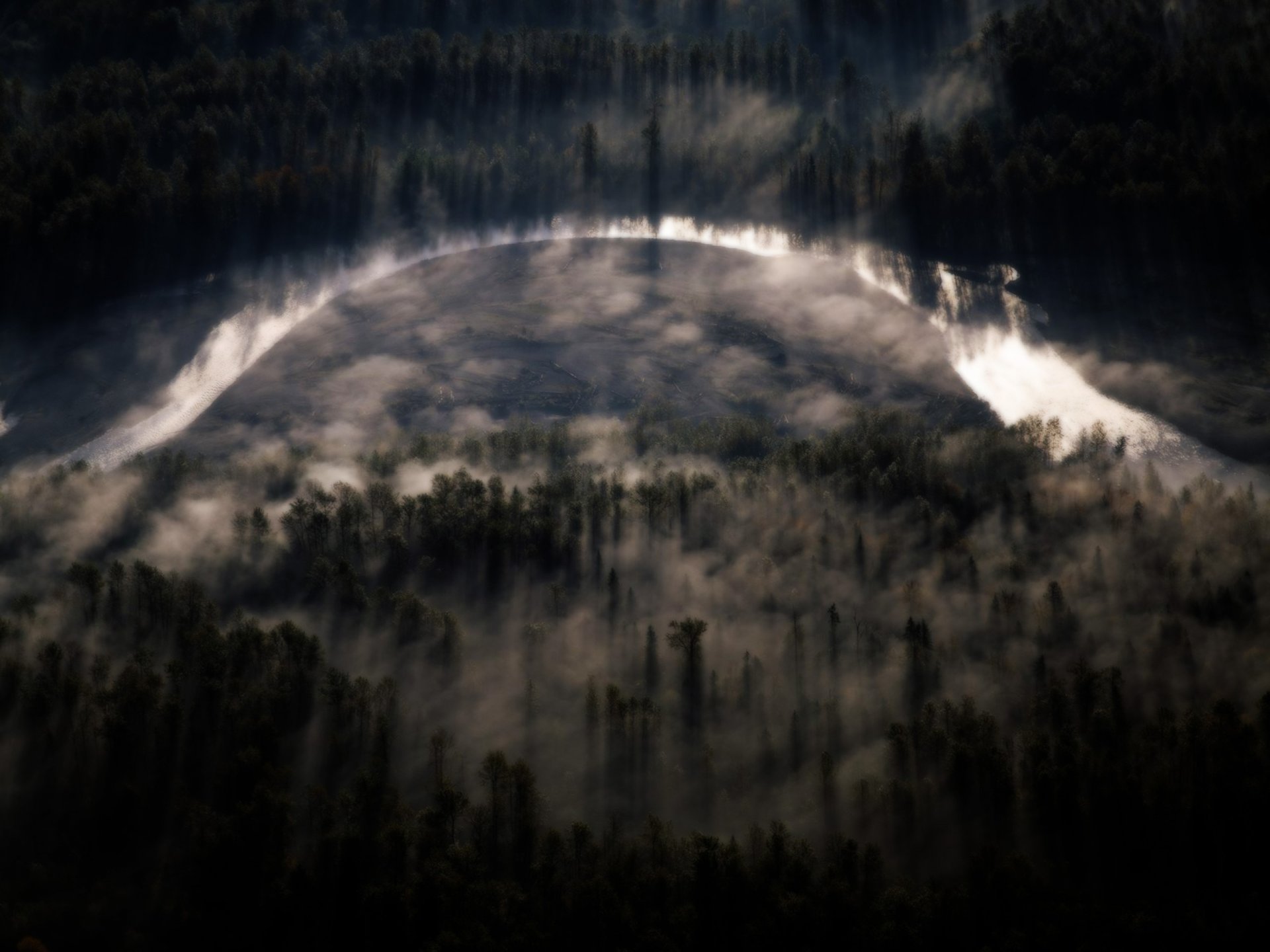 La nebbia si diffonde sul fiume e sulla fitta foresta
