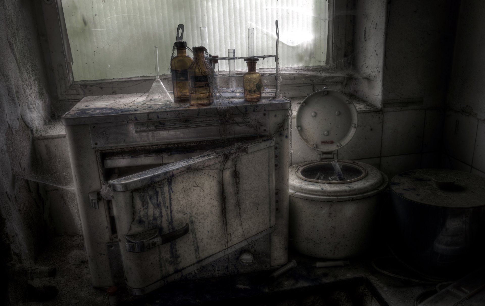 Laboratorio sporco sullo sfondo di una finestra fangosa