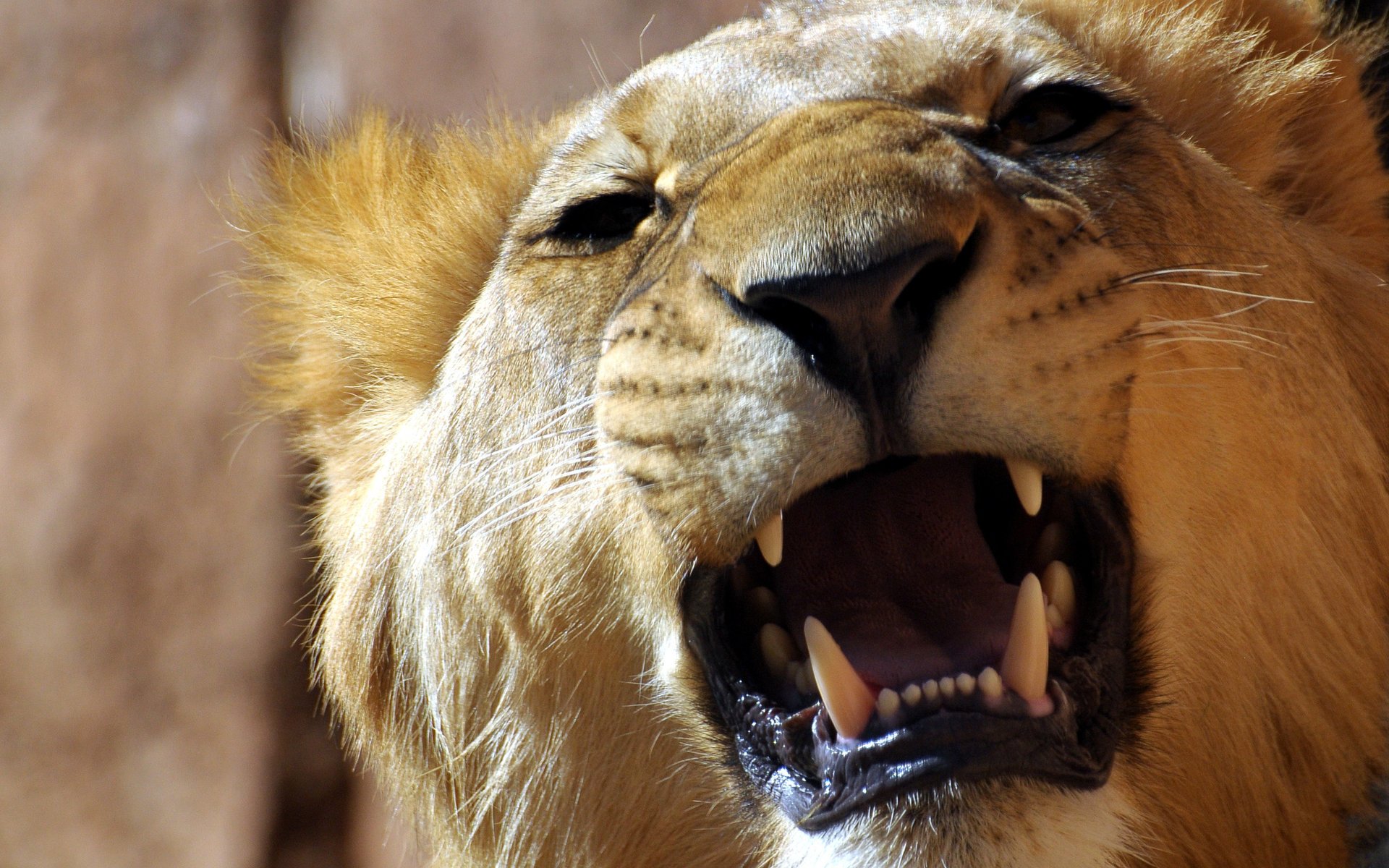 Il leone mostra artigli e zanne. Costruisce una smorfia