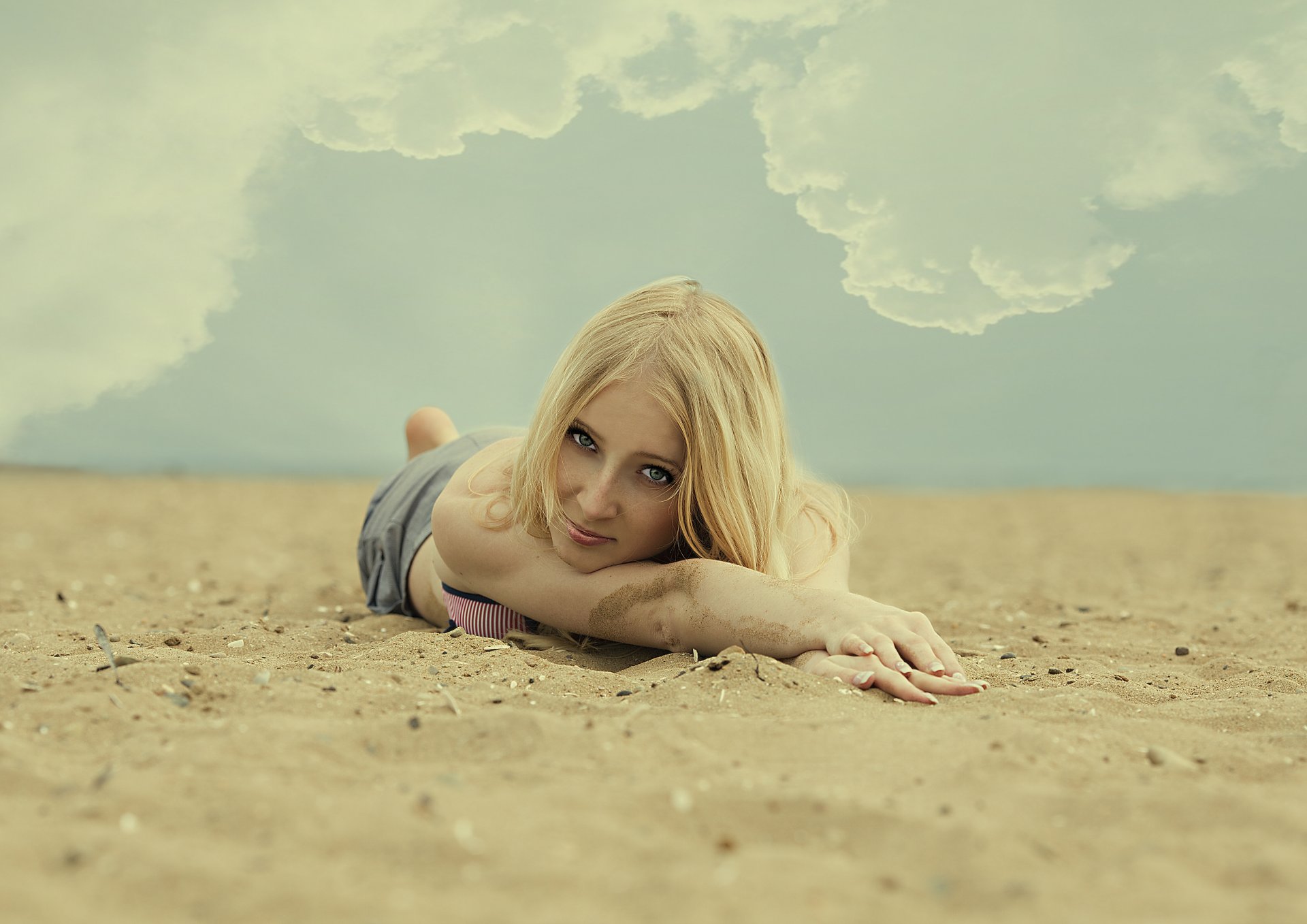 Jessica Alba sulla sabbia. Ragazza sulla sabbia. Sguardo in avanti