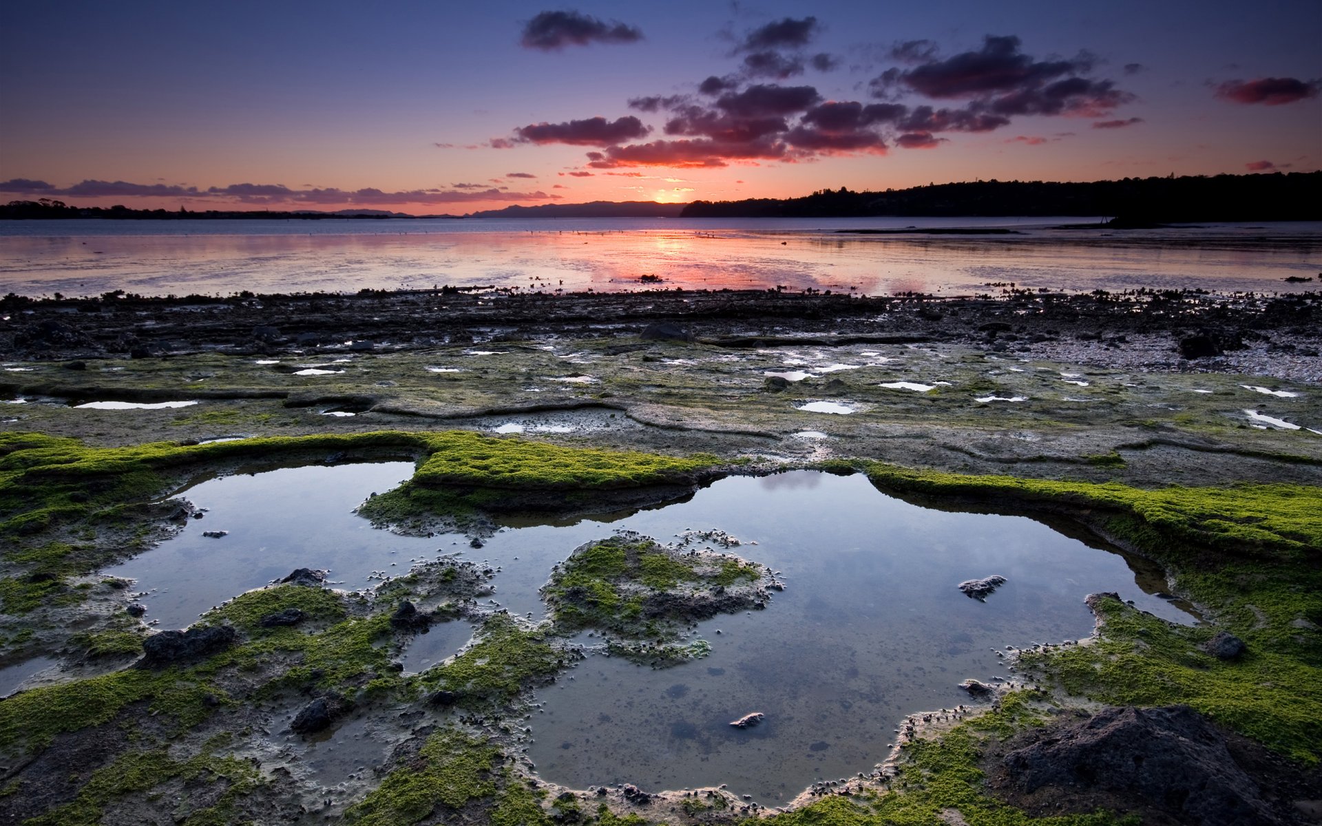 Baia al tramonto in lilla in Nuova Zelanda