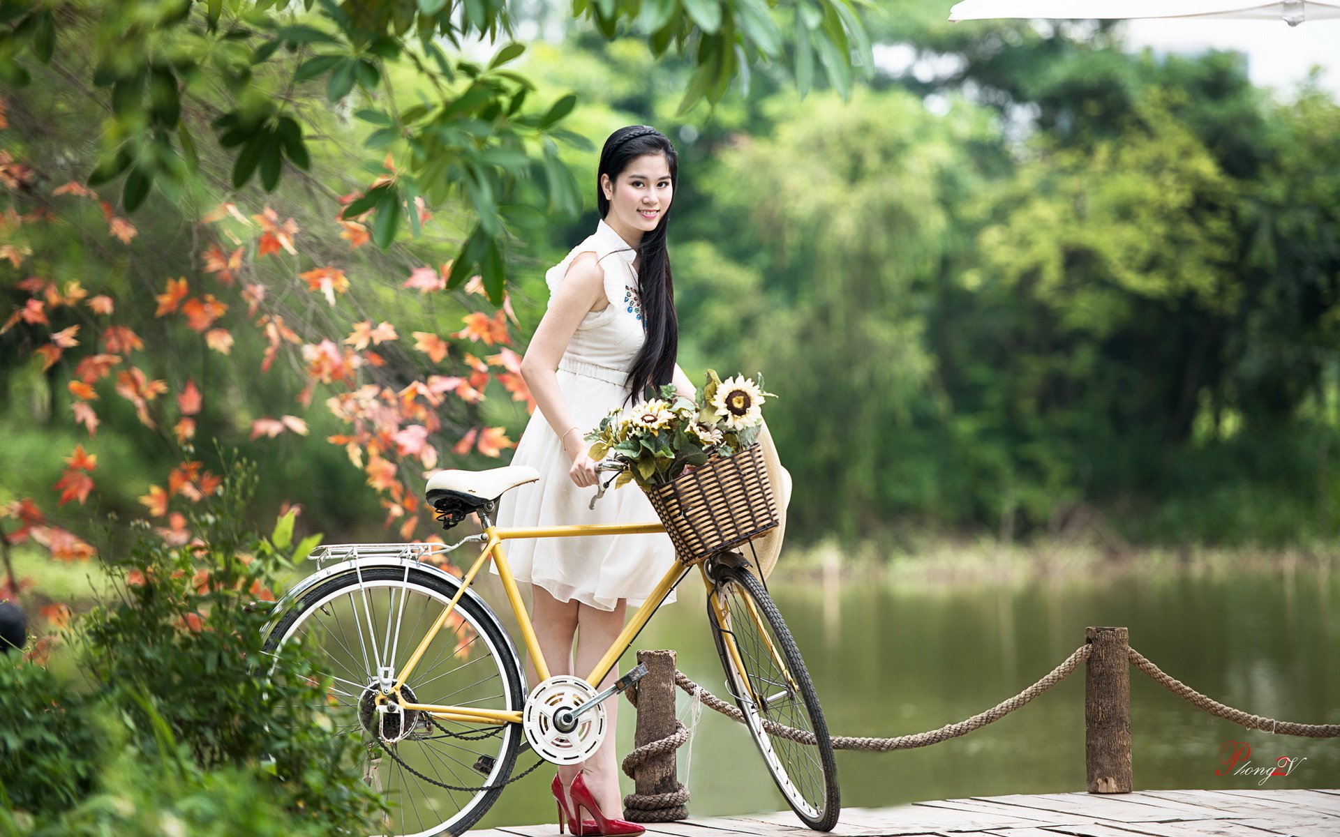 Ragazza asiatica che abbraccia la chitarra nella foresta