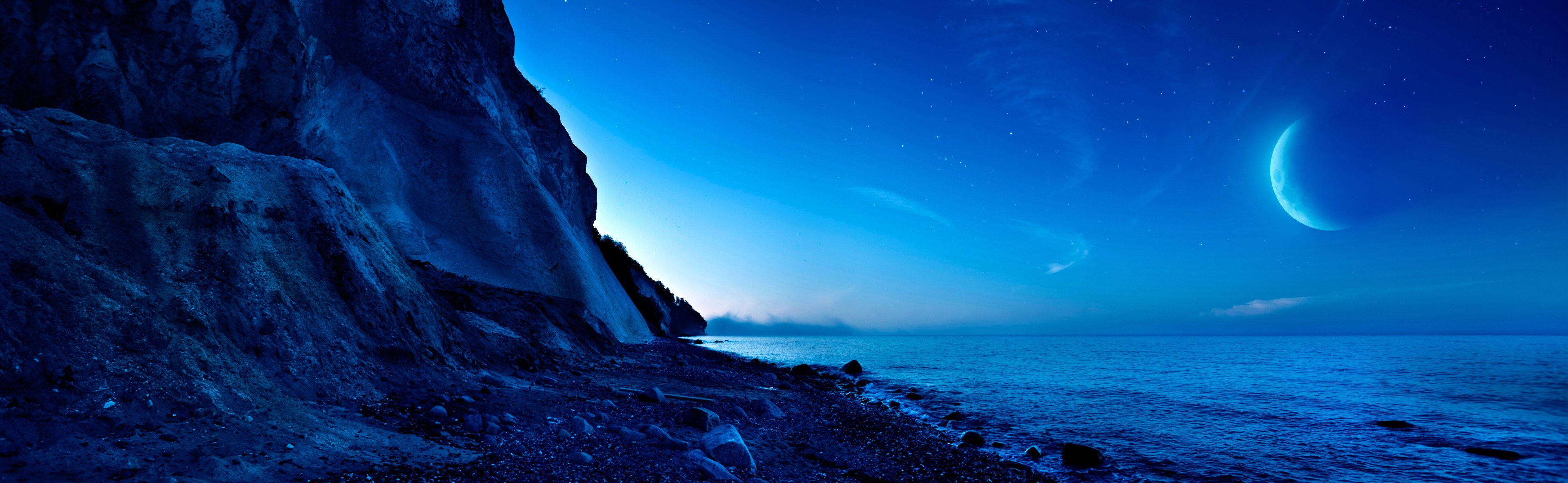 Luna nel cielo notturno sopra l'acqua e la montagna