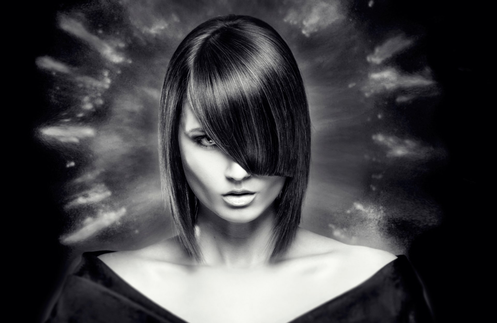 Immagine in bianco e nero di una ragazza con un quadrato e una frangia molto lunga