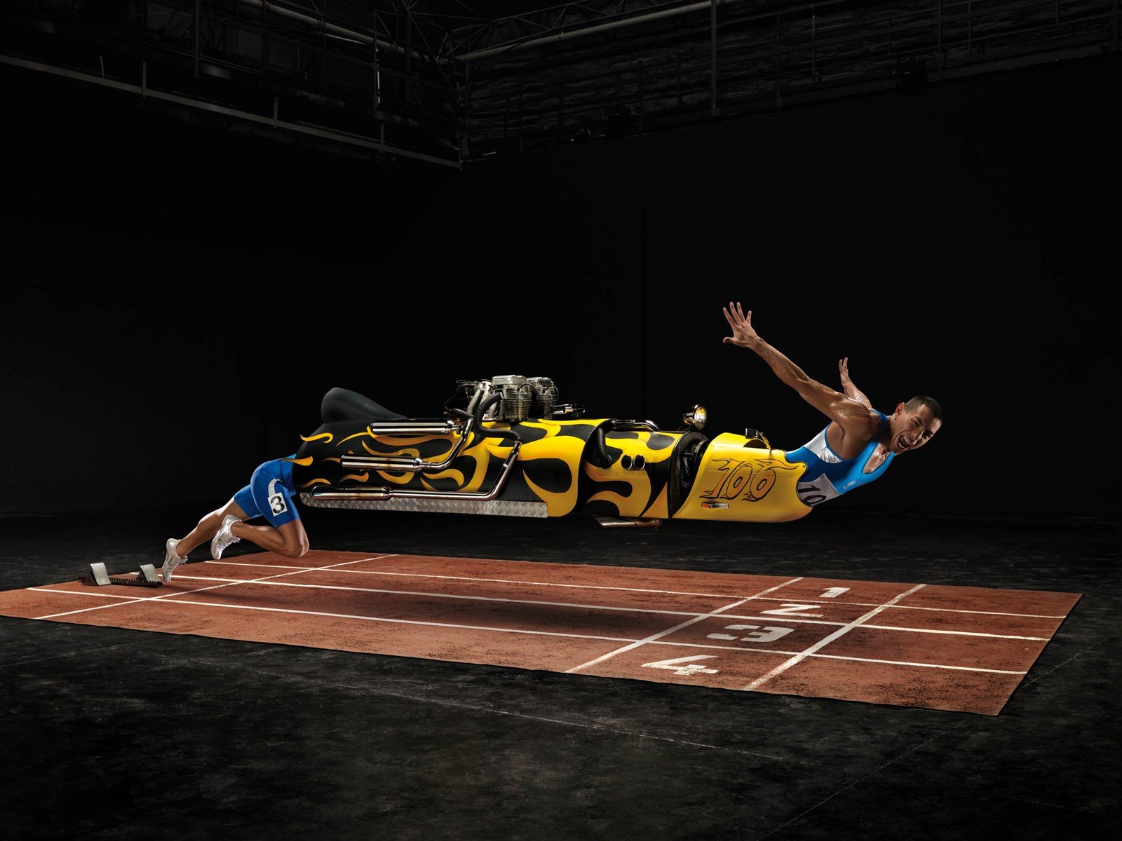 Simbiosi tra atleta e macchina gialla e nera per una migliore velocità