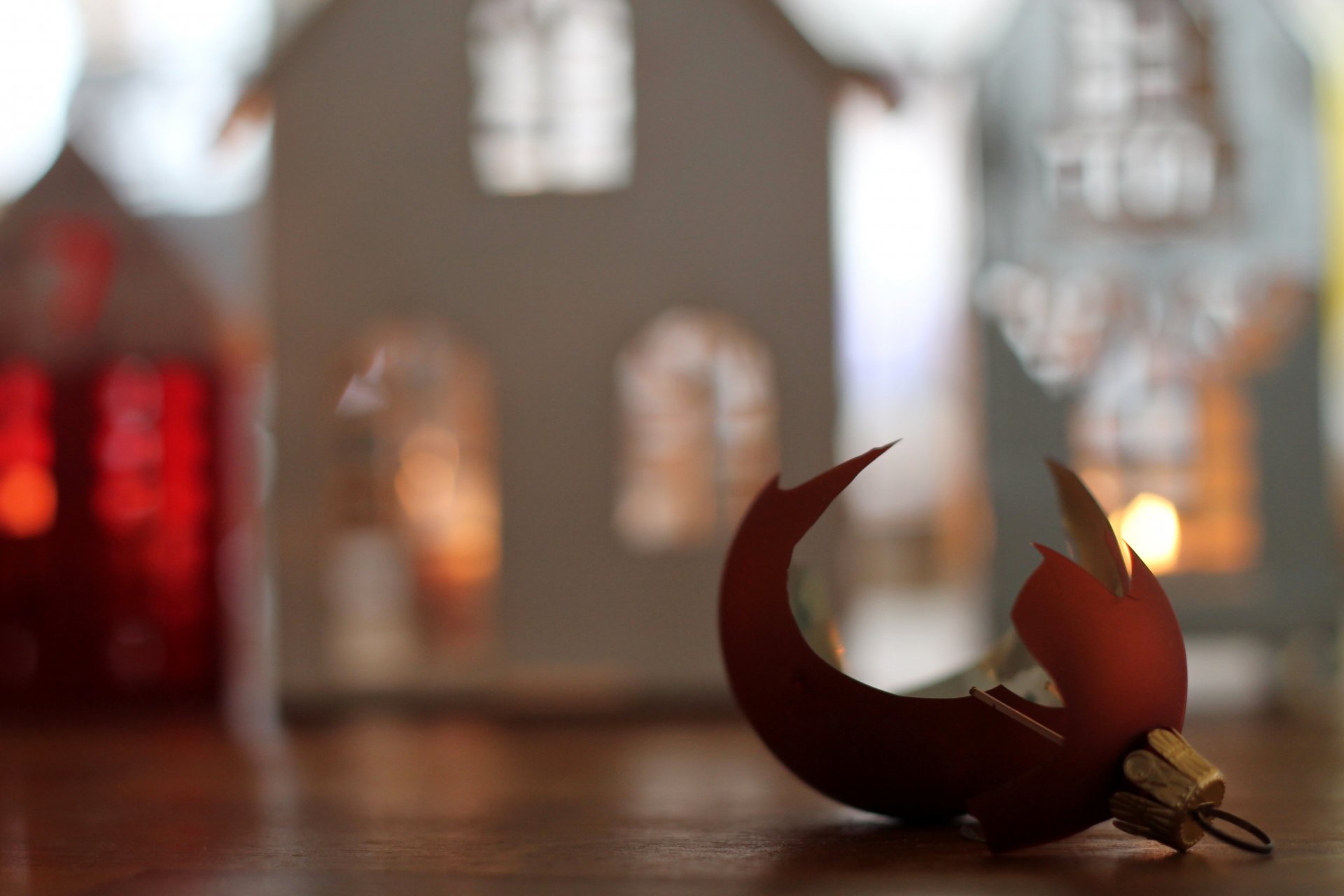 Giocattolo di Natale rotto sullo sfondo di una casa di carta