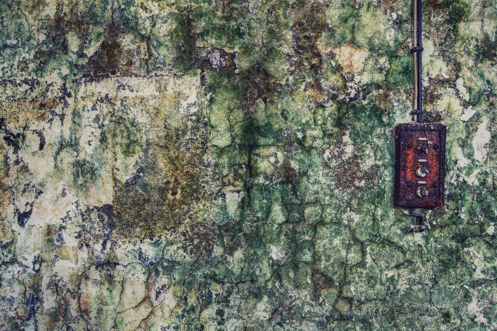 Muro con intonaco incrinato e interruttore con vernice screpolata
