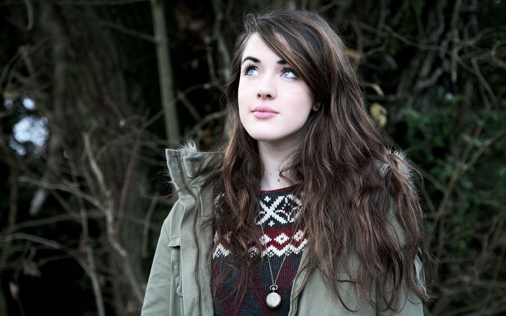 Ragazza carina con gli occhi grigi guarda in lontananza