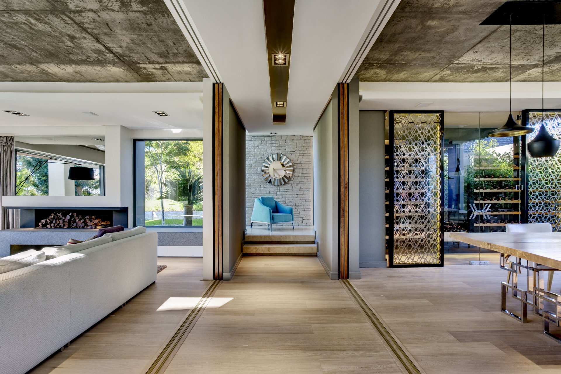 Bellissimo interno della stanza con grandi finestre e camino