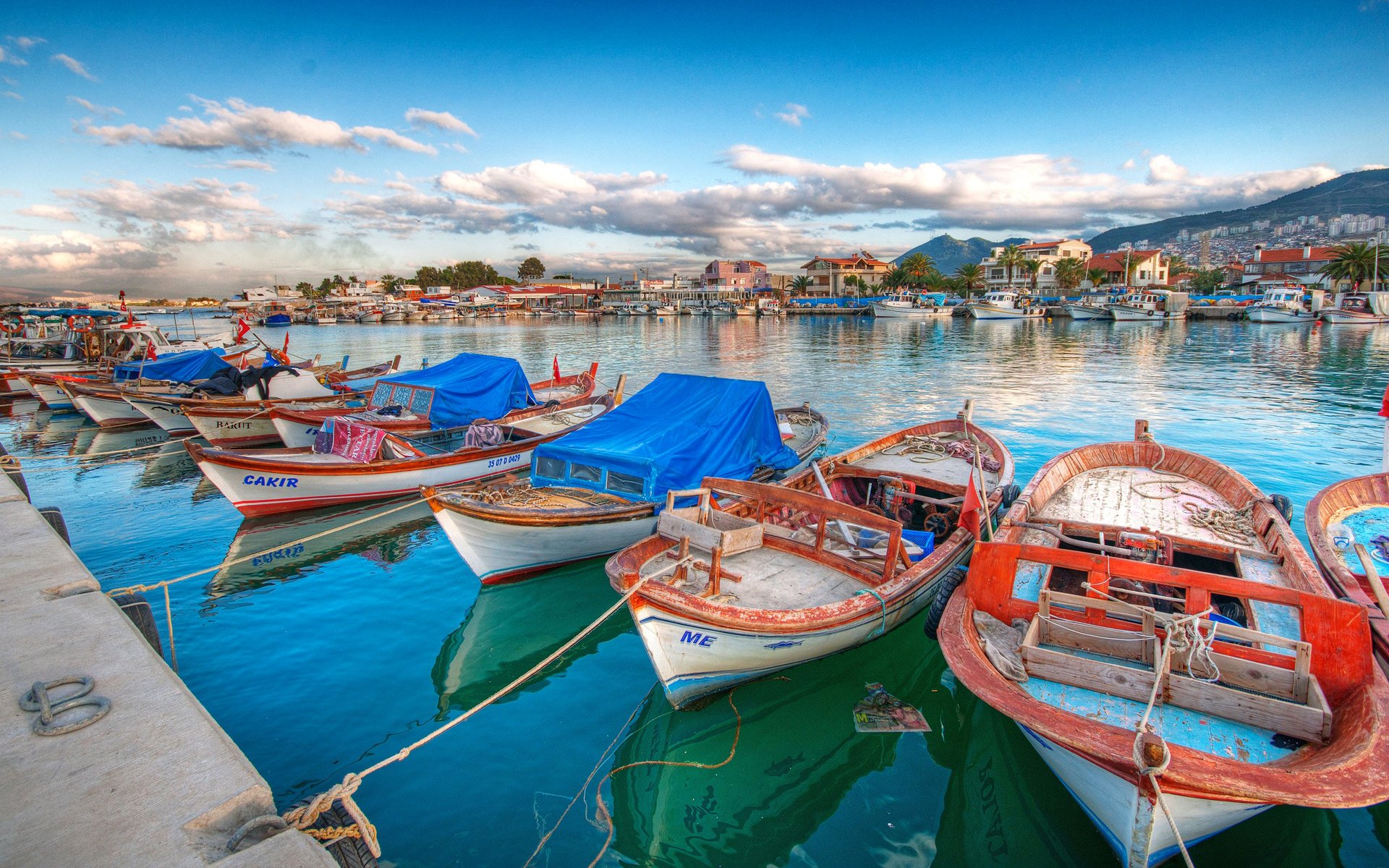 Moto Yamaha nera sul lungomare. Fontana. Barche al molo