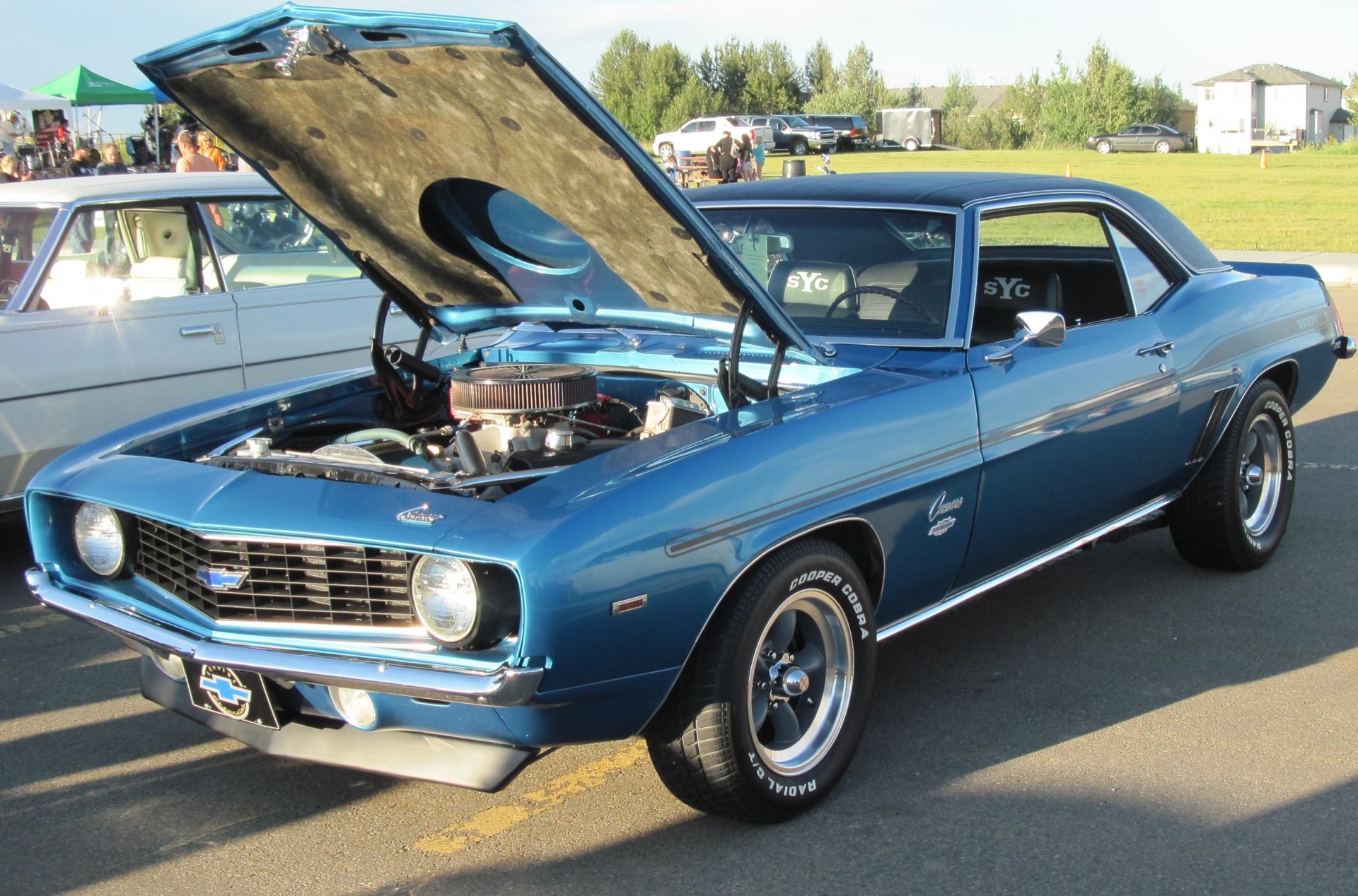 Auto blu con cofano aperto e striscia nera sul corpo