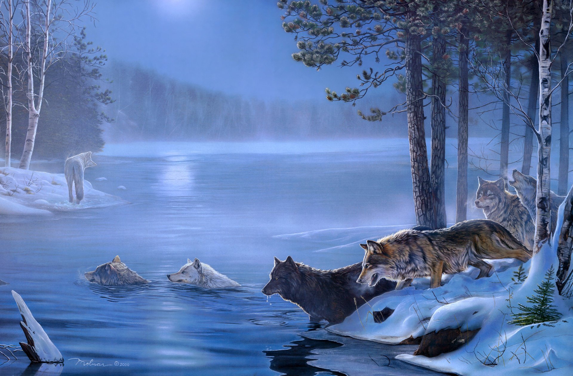 Un branco di lupi nella foresta invernale si fanno strada attraverso il fiume