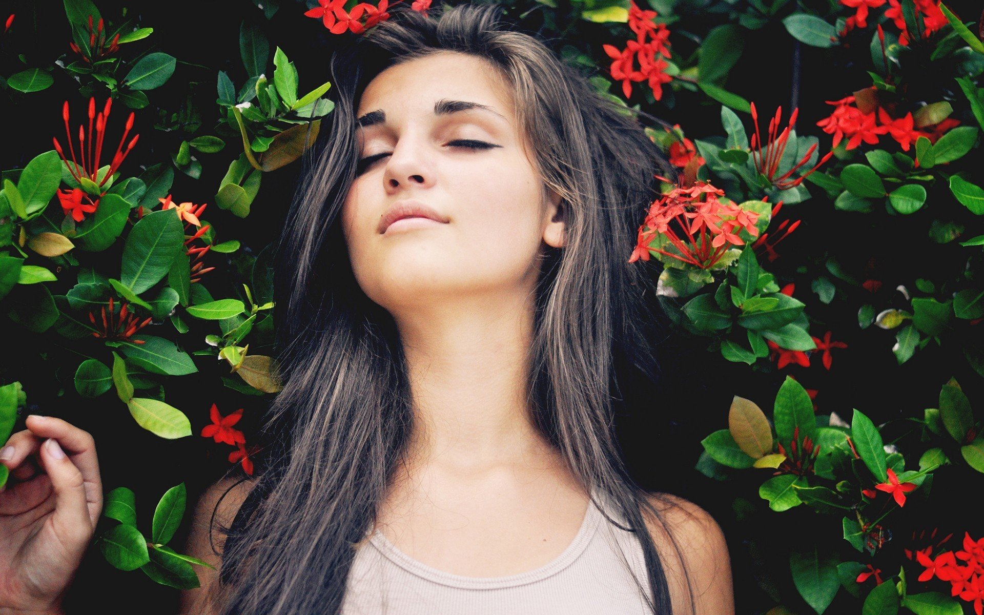 Ragazza bruna si trova su sfondo verde con fiori