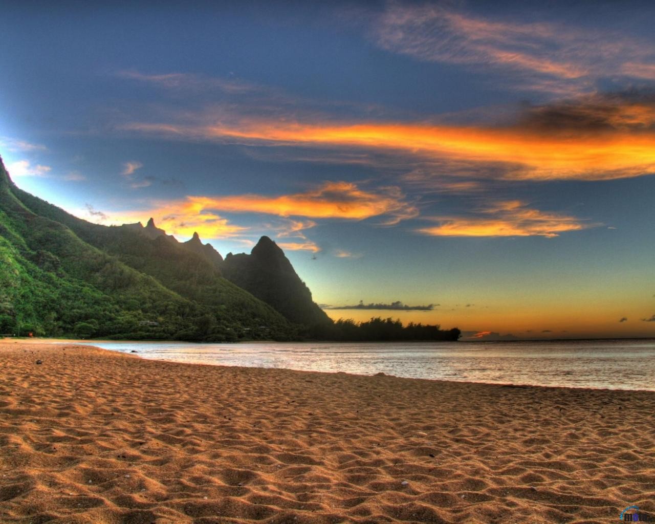 Spiaggia al tramonto sullo sfondo delle montagne e del mare