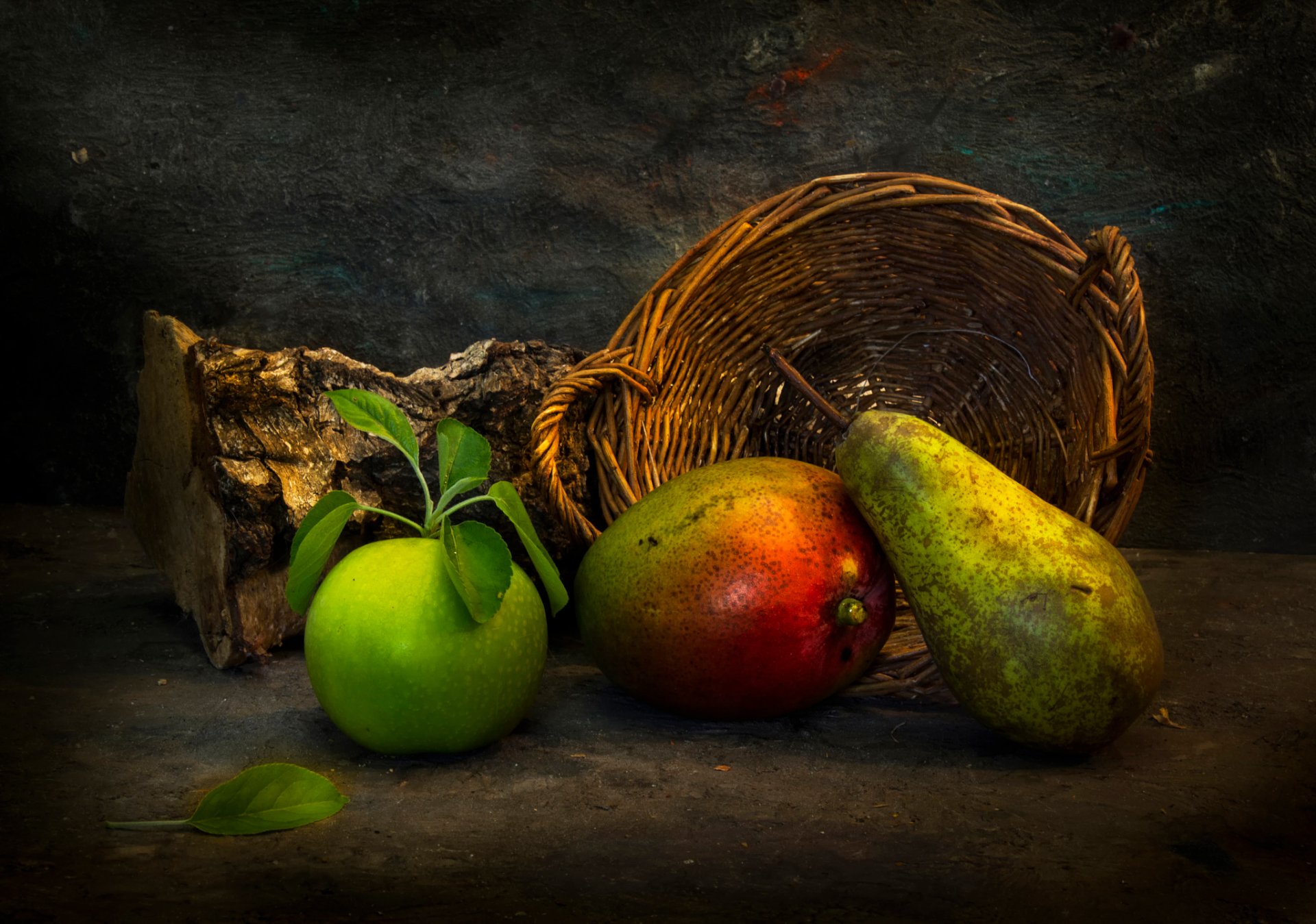 Natura morta bacche luminose e tovagliolo, pesche in una brocca trasparente, pere in una tazza