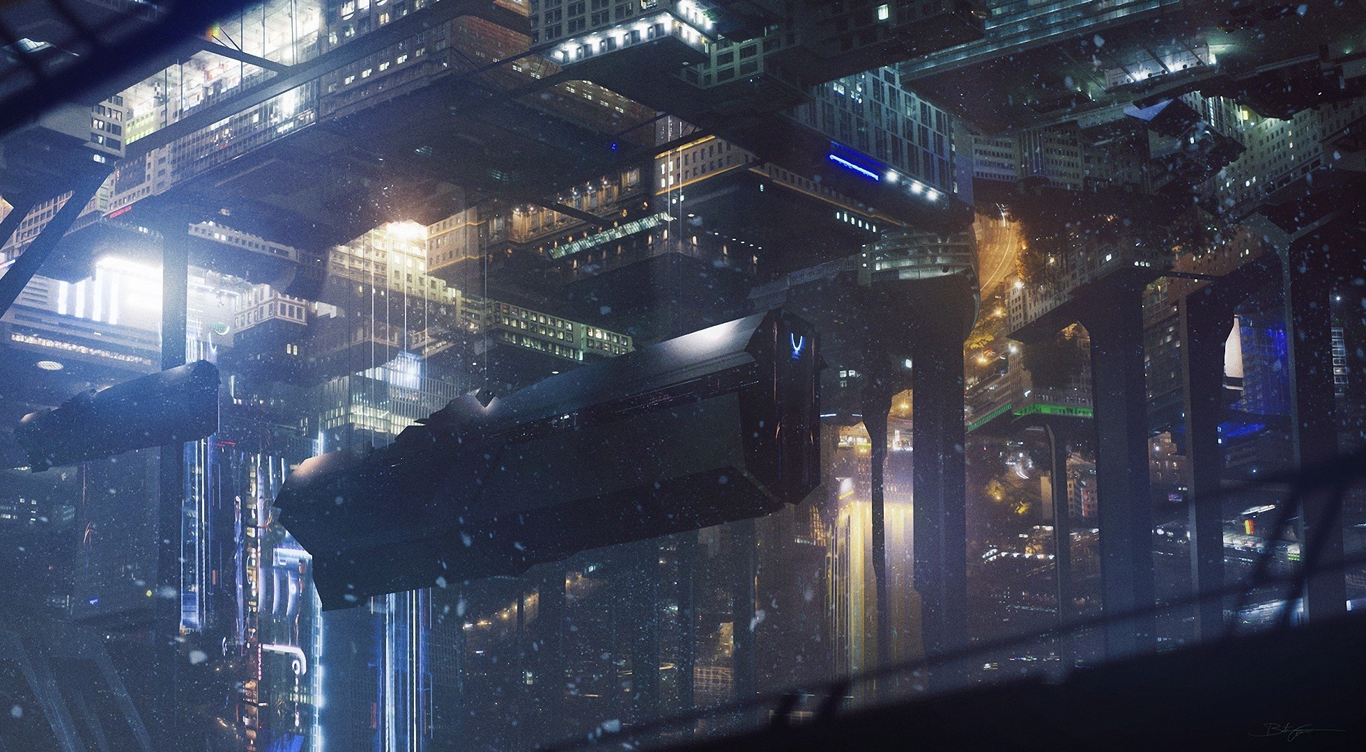 Gli aerei si dirigono verso la Città del futuro al tramonto