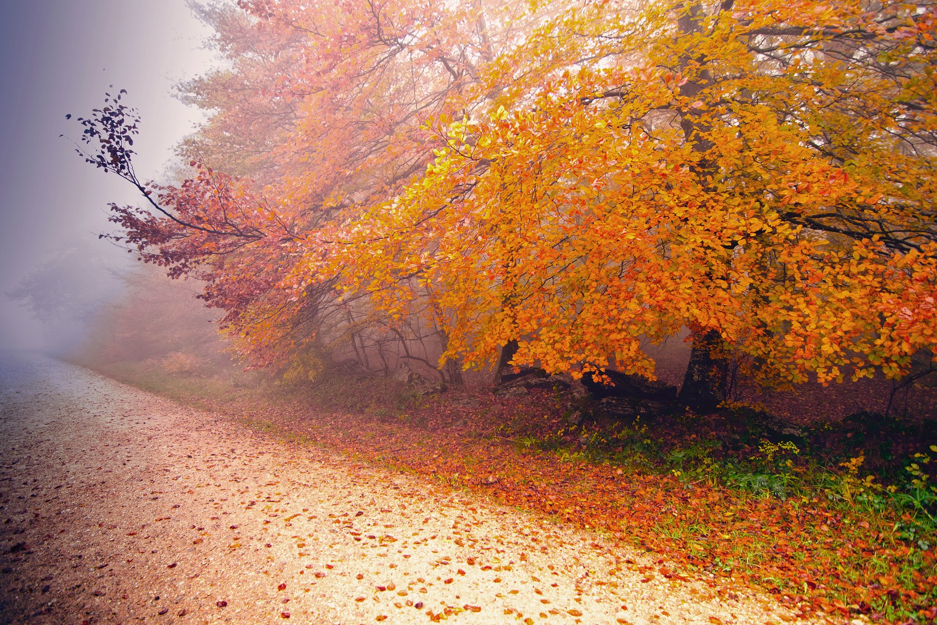 Autunno strada nebbiosa al mattino