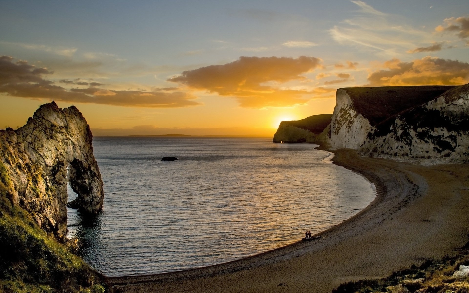 Costa rocciosa vicino alle onde di schiuma, tinta con una striscia giallo-arancione del sole al tramonto coperto da nuvole marroni