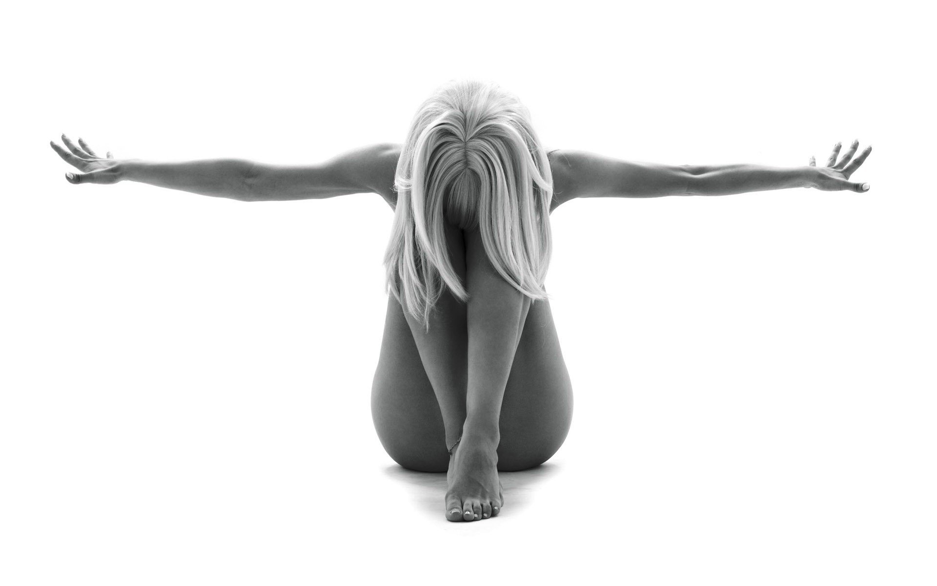 Ragazza nuda si siede con le braccia aperte