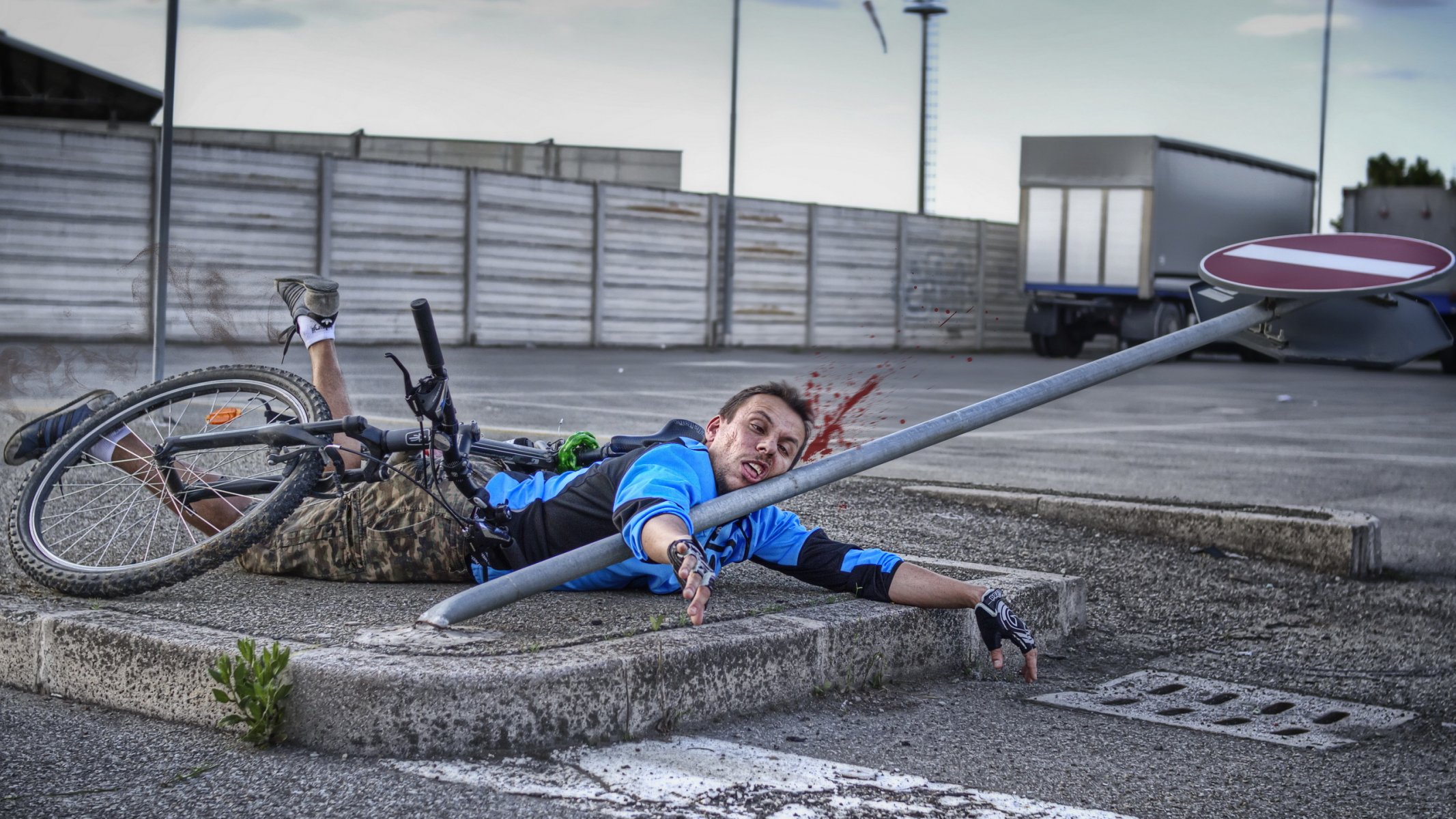 Un uomo su un orso in bicicletta cerca di sfuggire alle bestie misurate