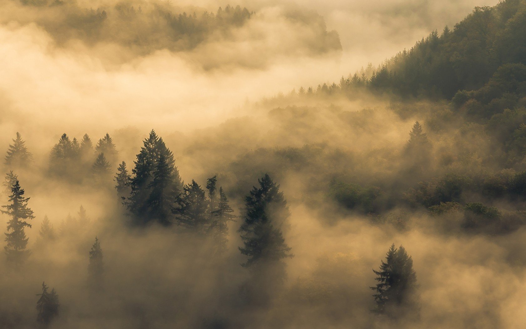 Mattina nebbiosa sopra piccole case tra erba verde e alberi