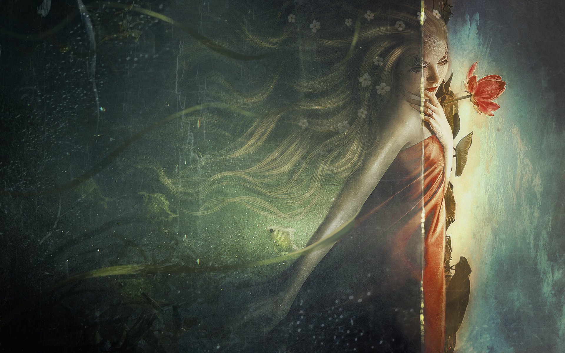 Ragazza Ofelia in rosso con un fiore in mano