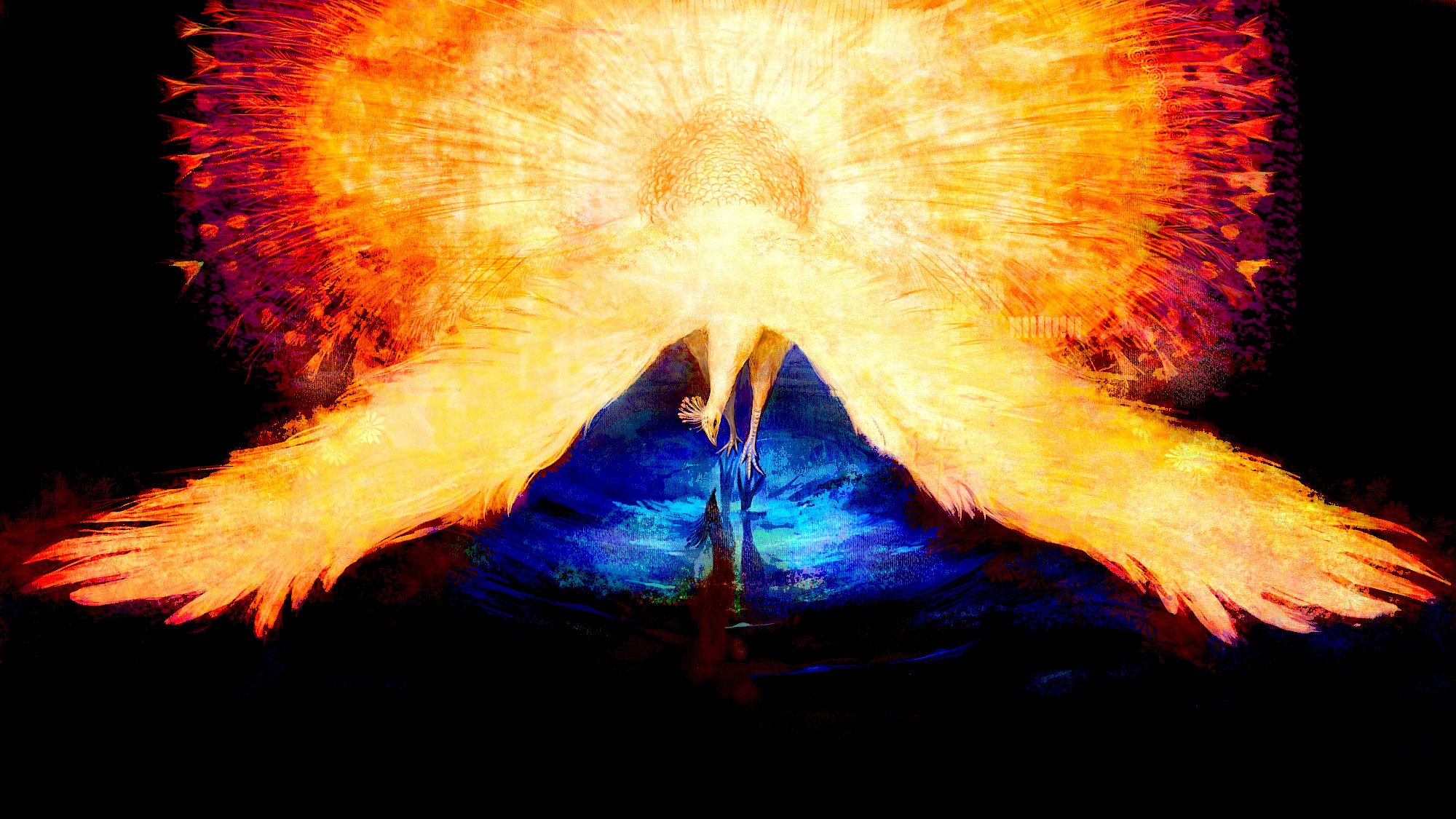 Uomo dei cartoni animati con acconciatura afro e uccello in testa in piedi in un campo d'oro