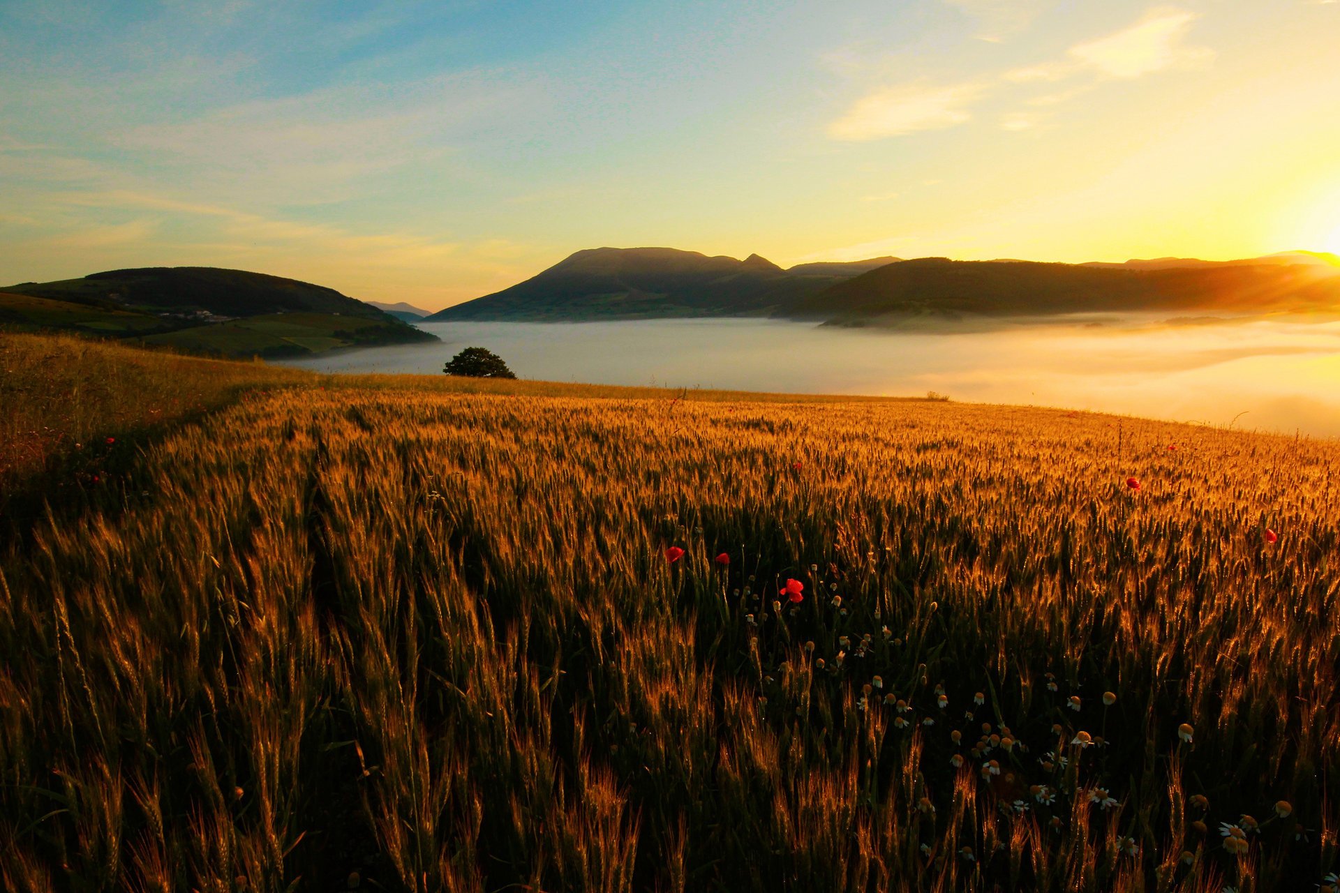 Paesaggio del tramonto sul campo di fiori