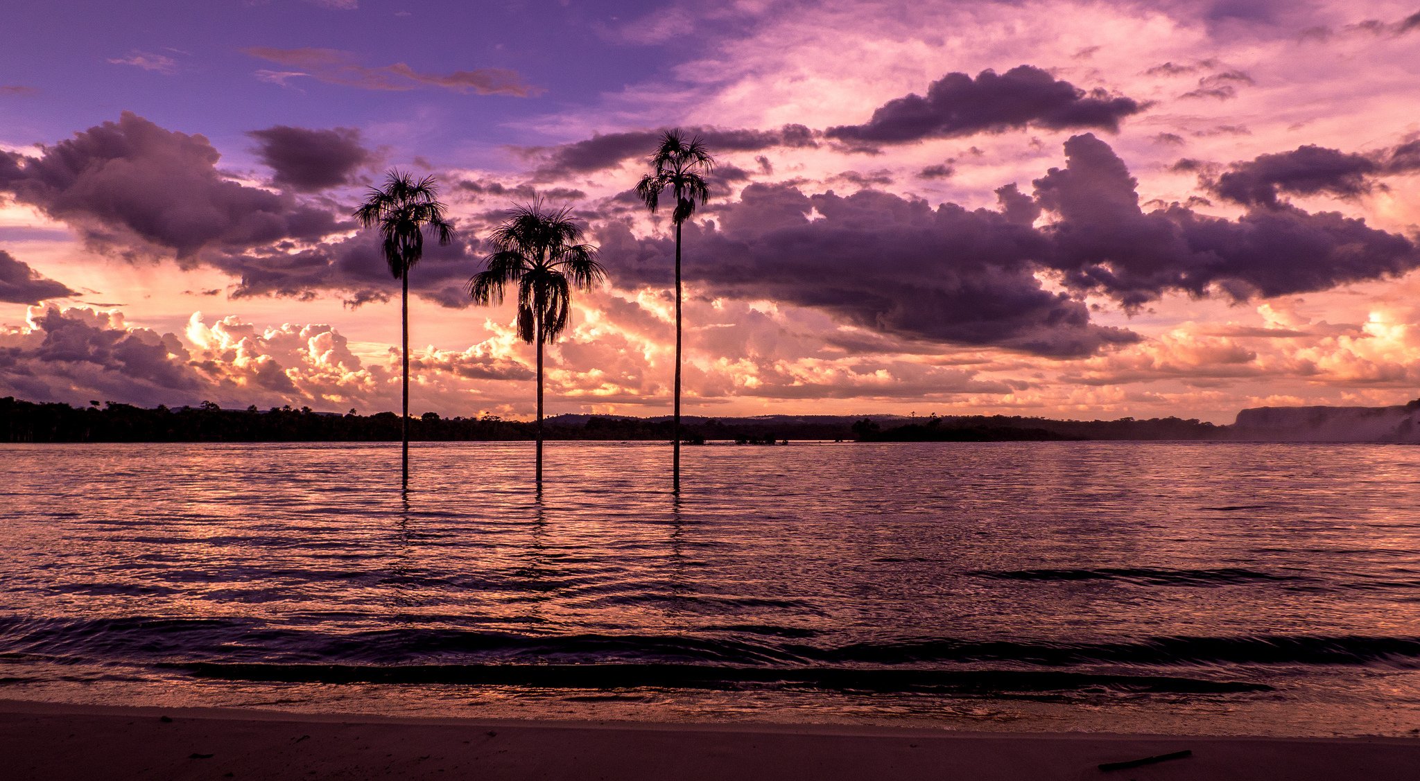 Isola tropicale nell'oceano con palme sopra l'acqua, cielo sereno e sole
