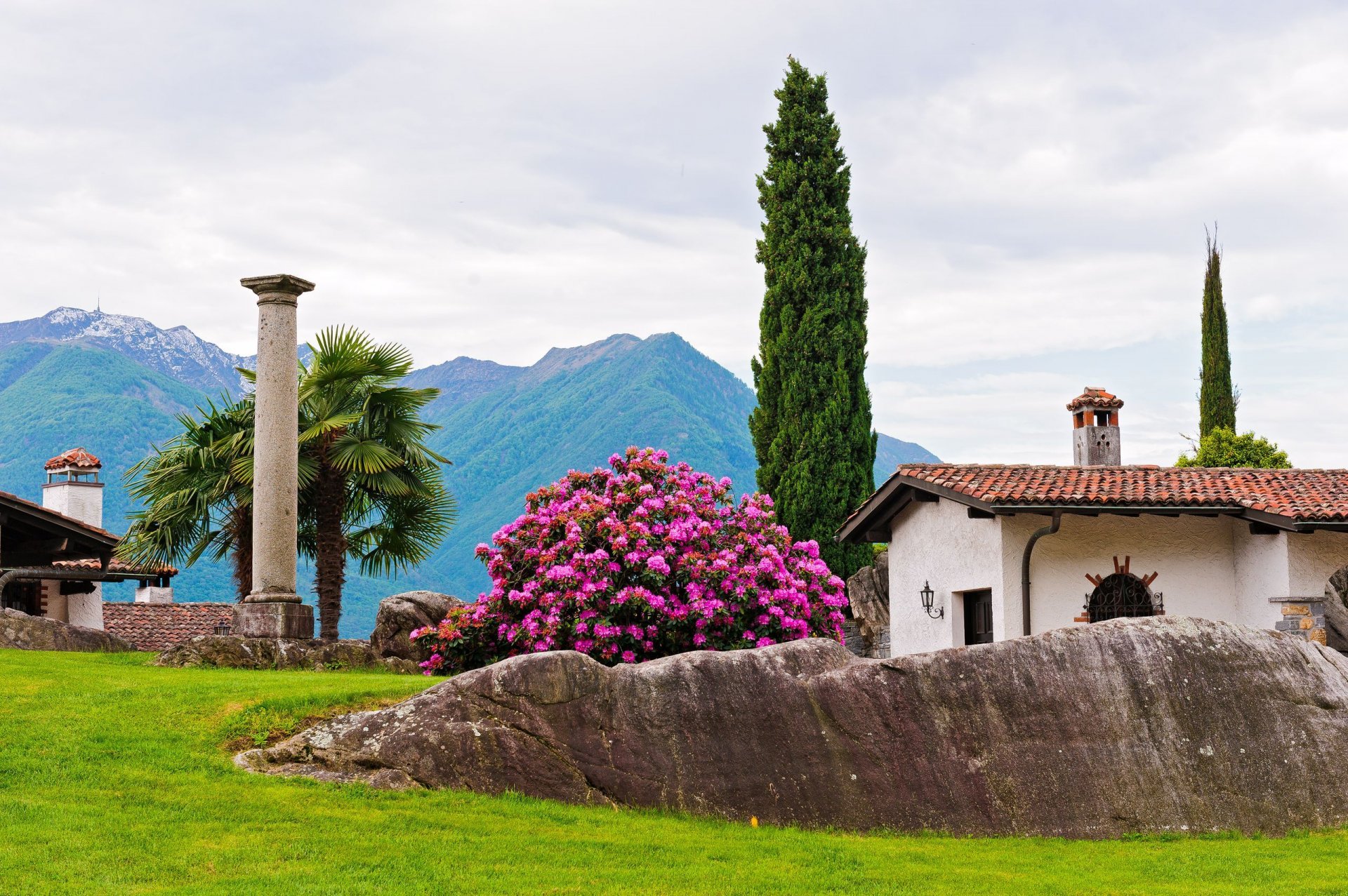 Paesaggio di montagna con colonne e palme sullo sfondo della casa