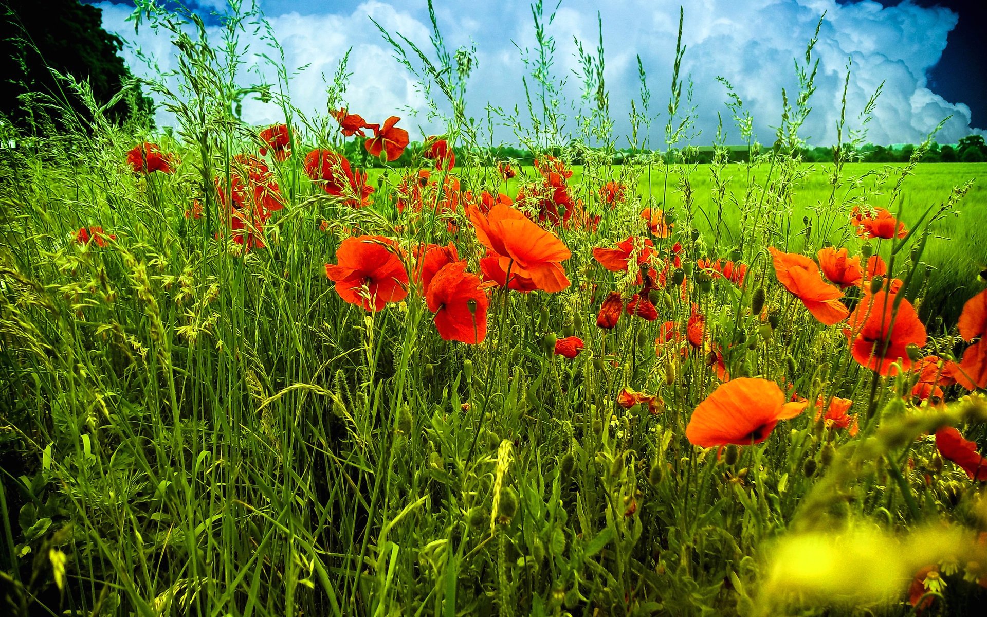 I papaveri selvatici arrossiscono nei raggi luminosi del tramonto