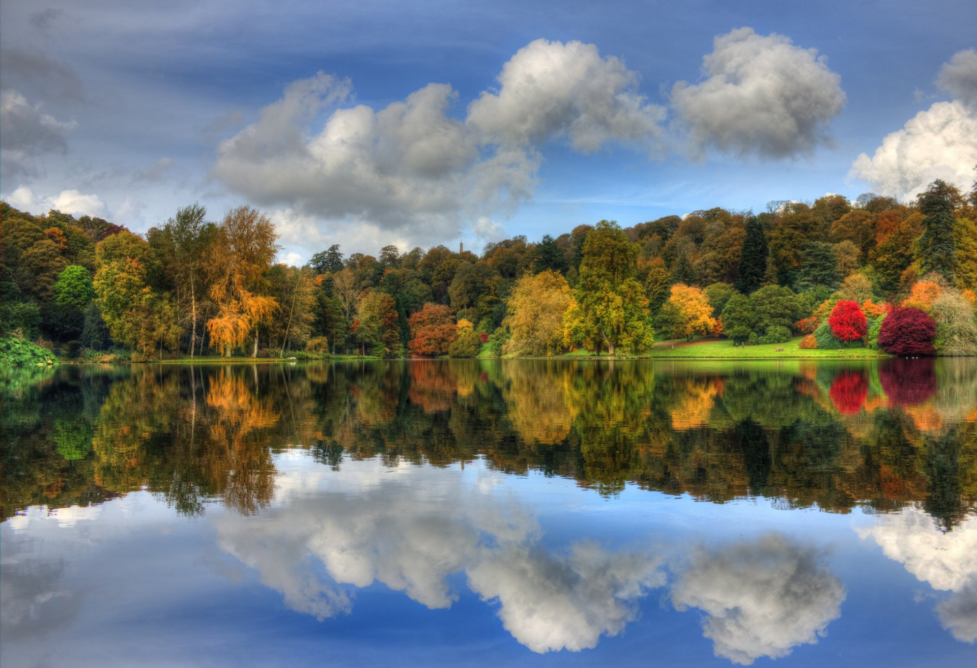In un bellissimo parco nel lago riflesso del cielo blu