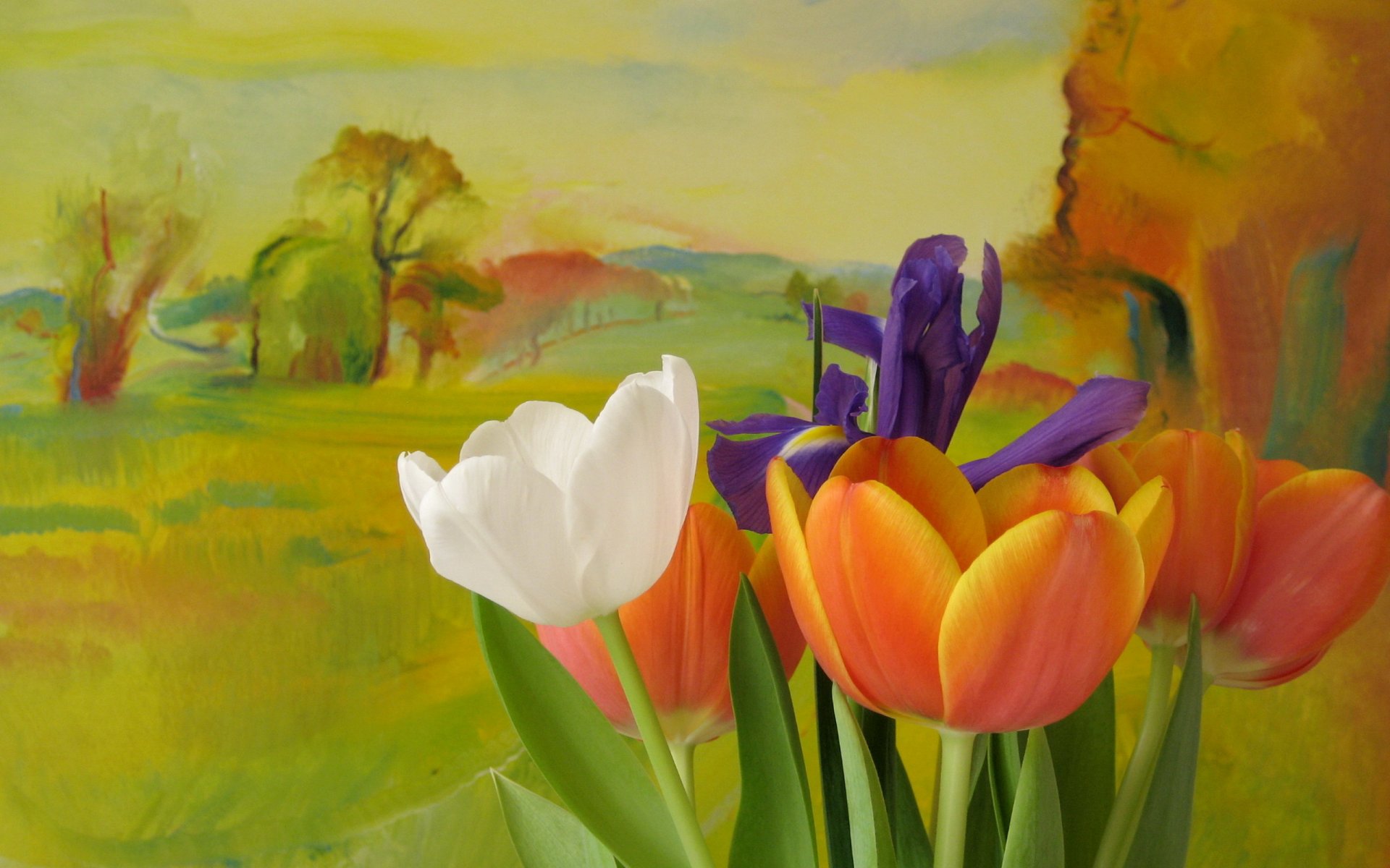 Tulipani aperti sullo sfondo di una valle verde