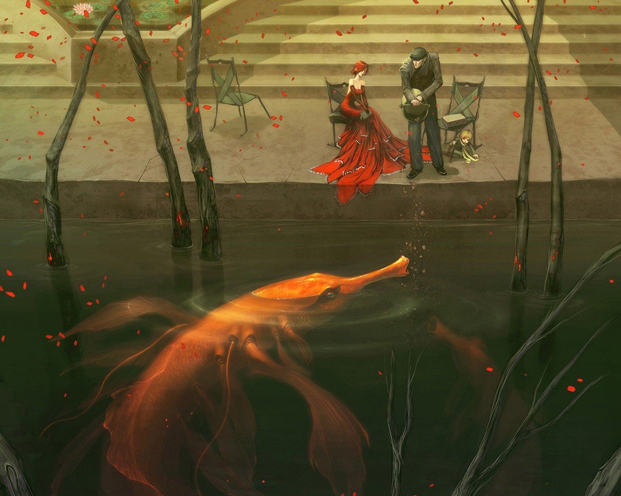 La gente si siede vicino al lago in cui nuotano Grandi Pesci