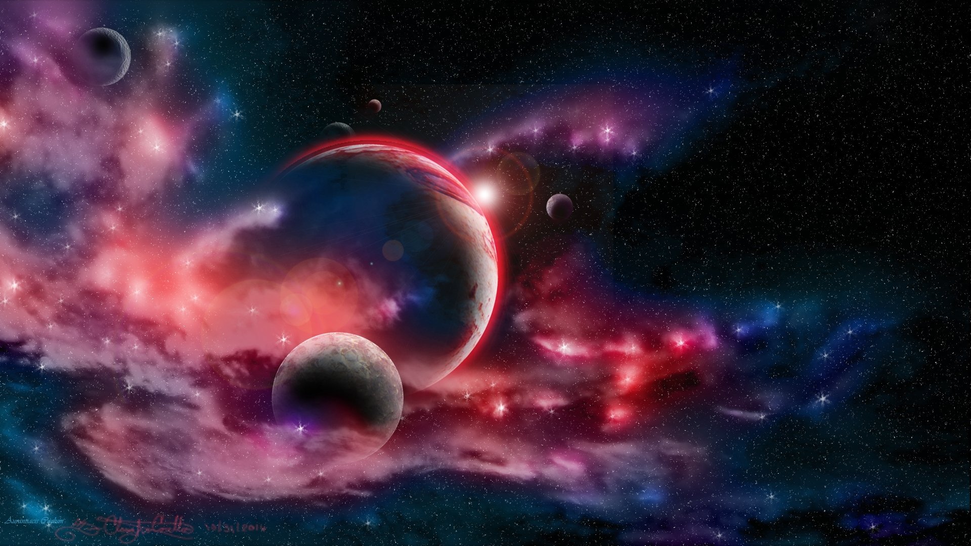 Due pianeti spaziali inghiottiti da lampi luminosi e asteroidi e navi volanti che si avvicinano a loro