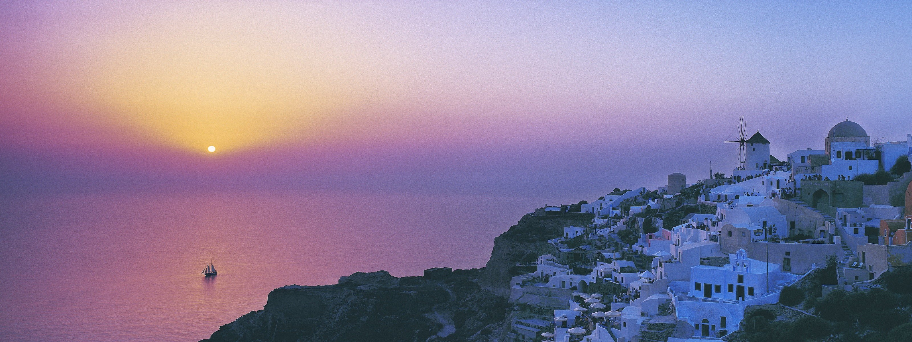 Alba variopinta sopra l'oceano vicino alla piccola città