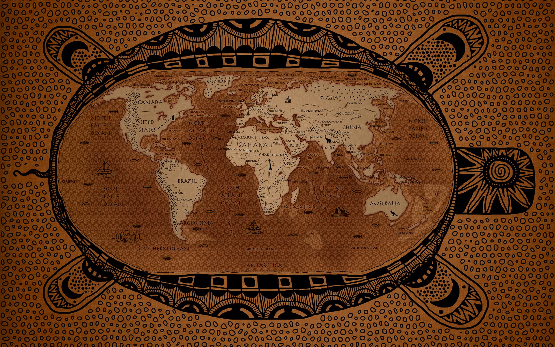 Mondo cartografico sul corpo di una tartaruga