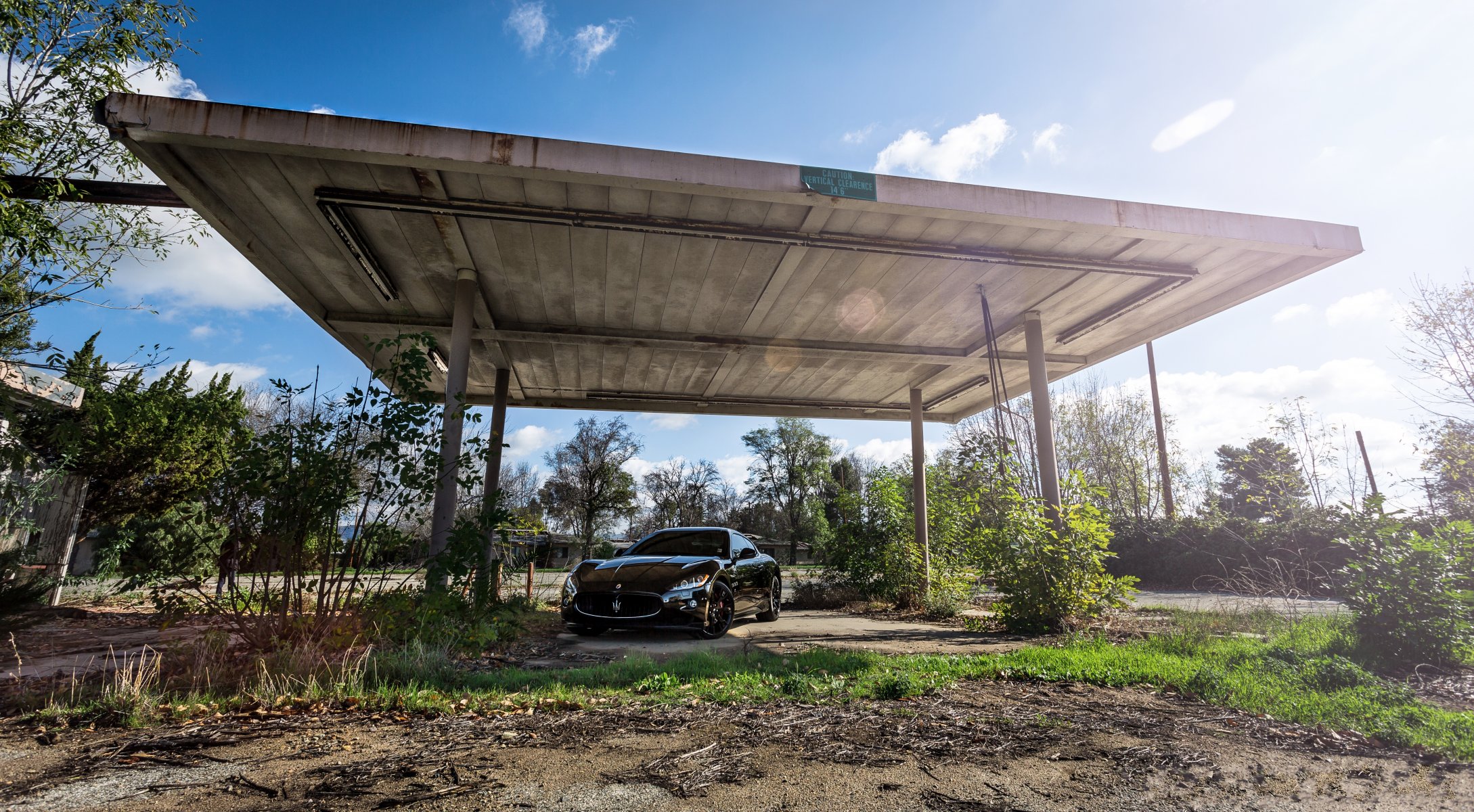Maserati nella natura in piedi sotto un enorme baldacchino