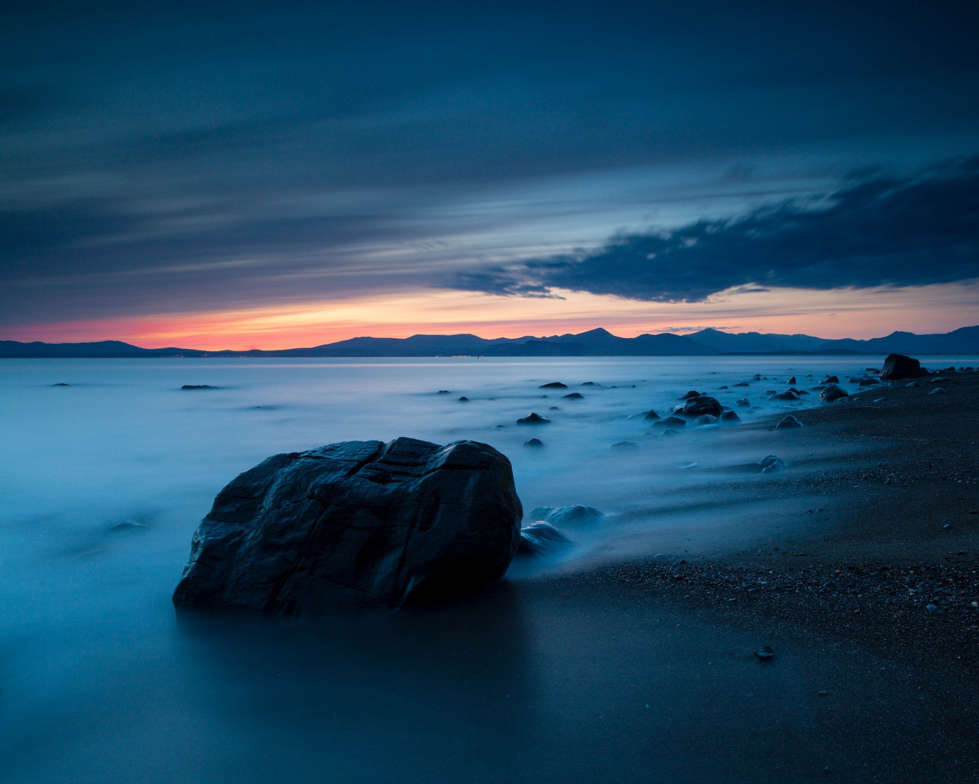 Pietre sulla spiaggia sullo sfondo delle montagne