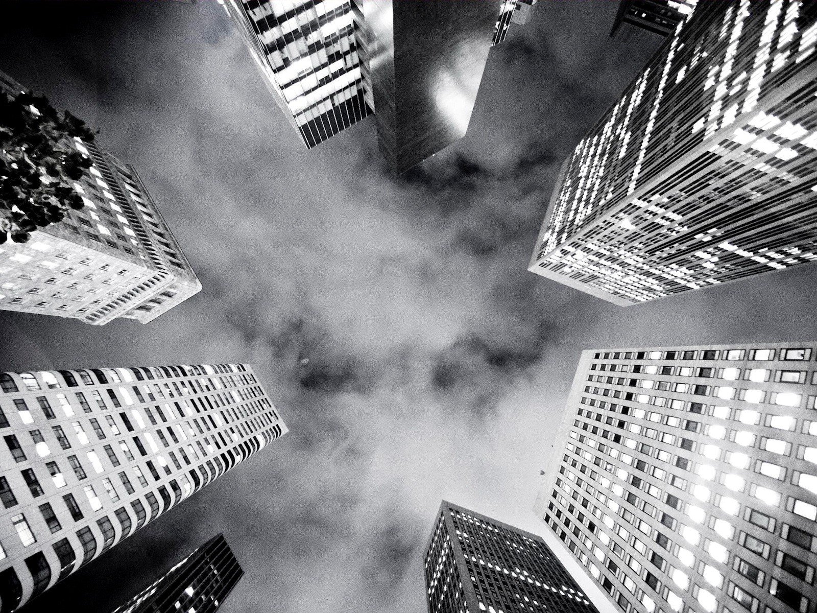 Vista dal basso dal fiume sul ponte di Brooklyn, Manhattan e le nuvole