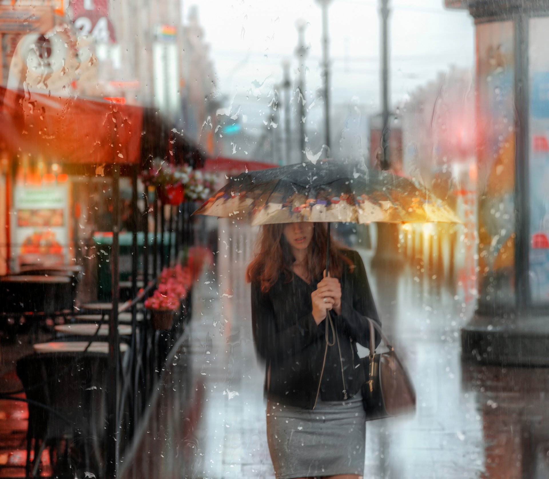 Ragazza sotto l'ombrello sotto la pioggia estiva a San Pietroburgo