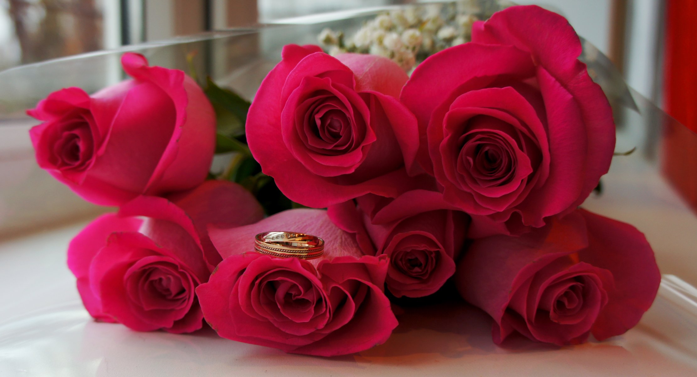Mazzo di rose sul tavolo. L'anello giace sul bocciolo