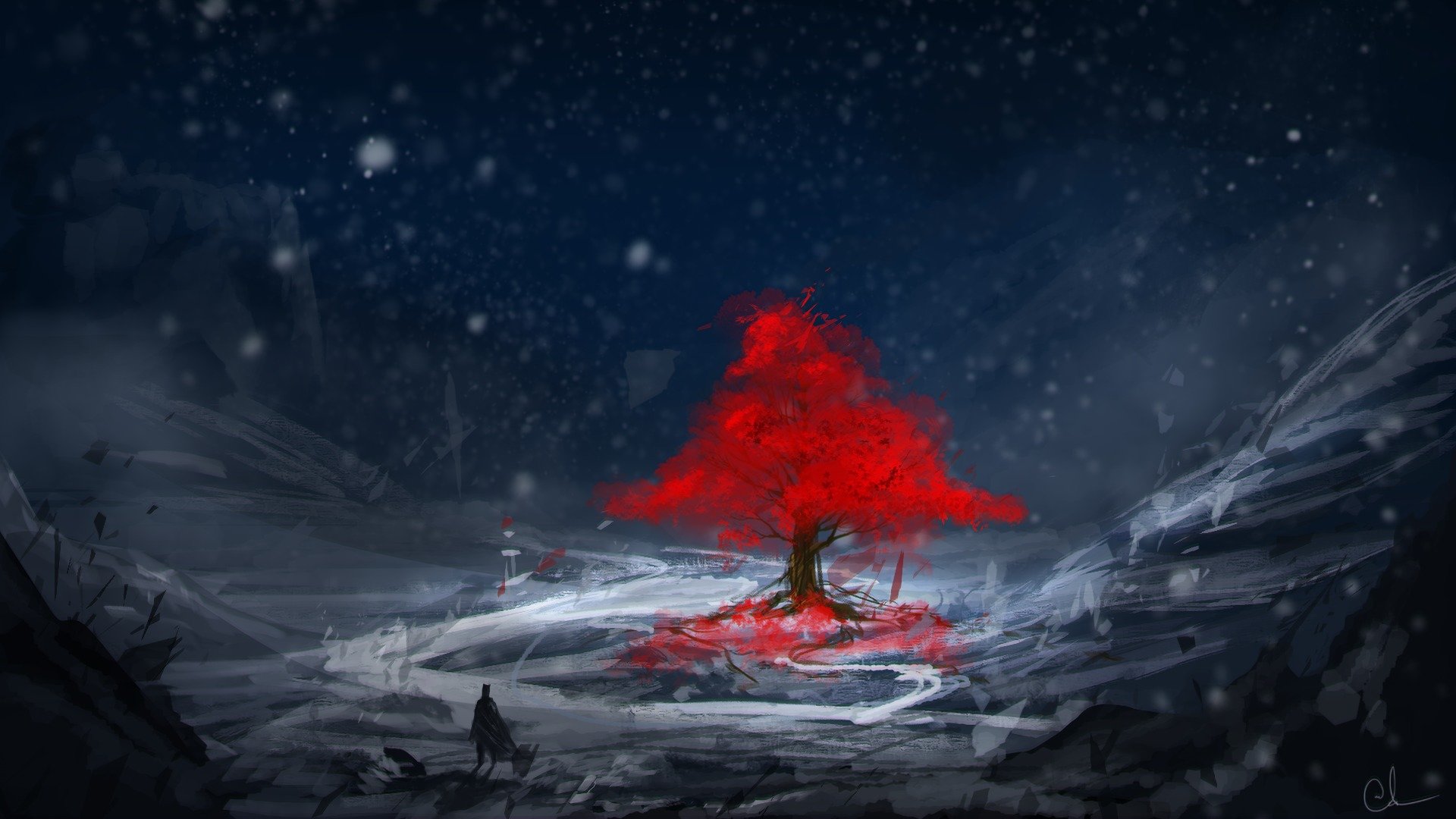 In inverno, in abiti rossi, l'albero è in piedi