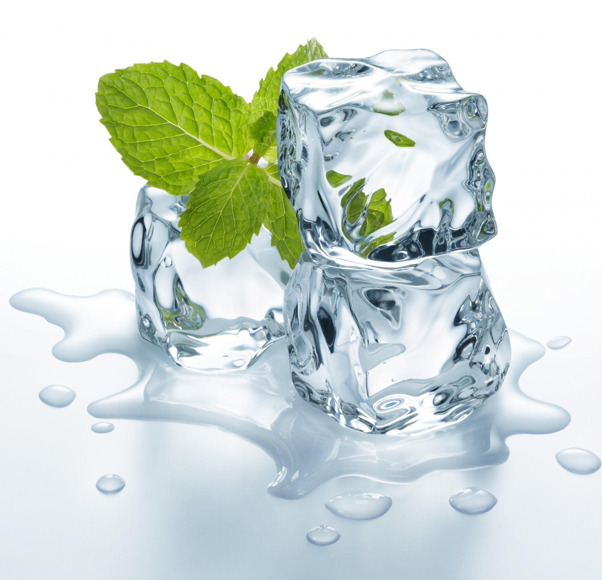 Cubetti di ghiaccio che si sciolgono e menta che giace su di loro