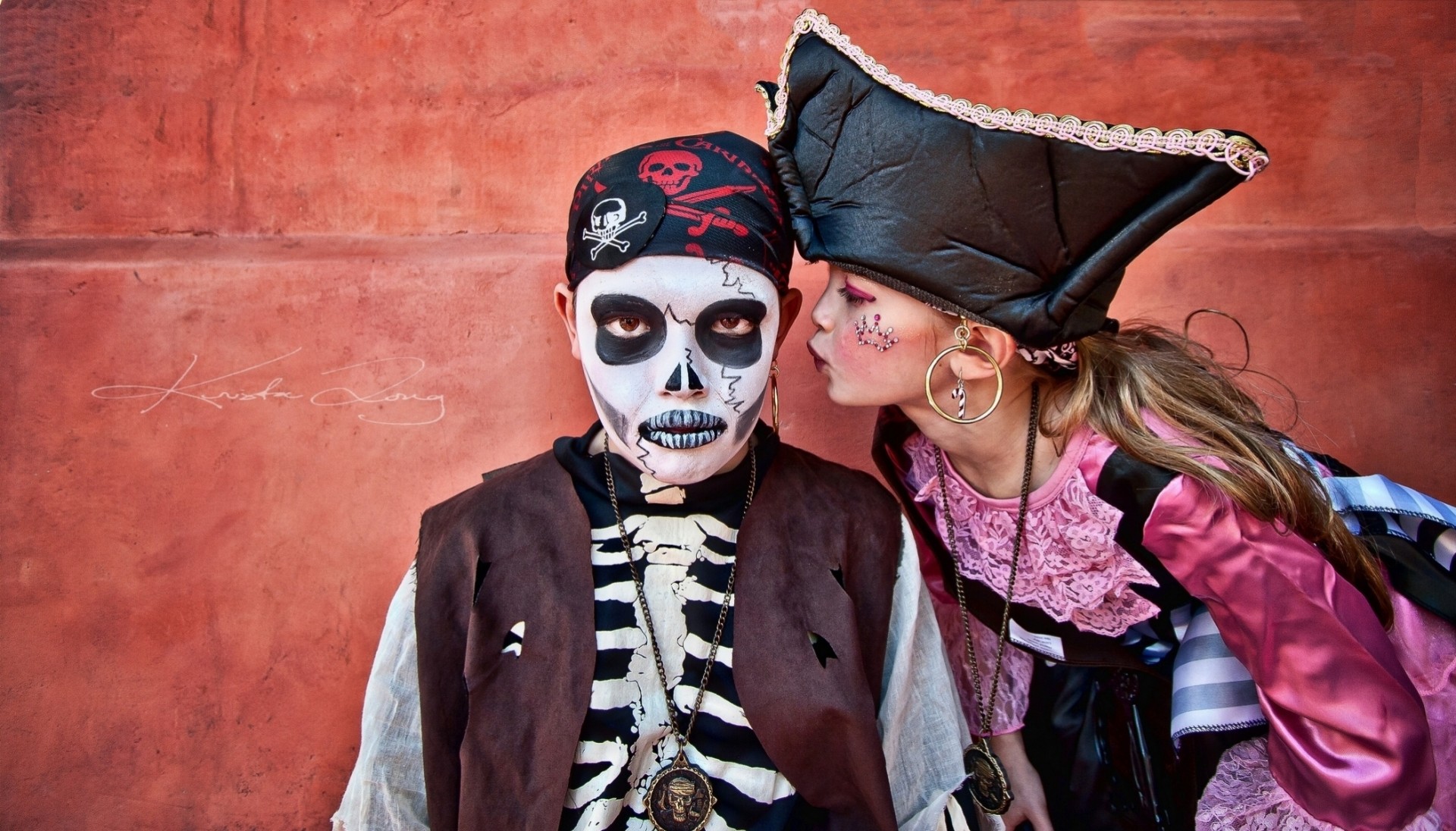 Una ragazza in costume da pirata bacia un ragazzo